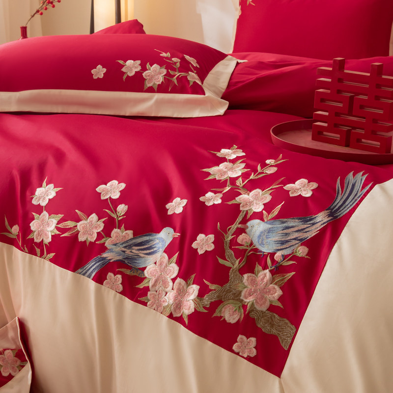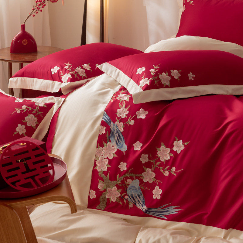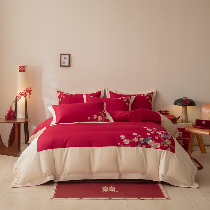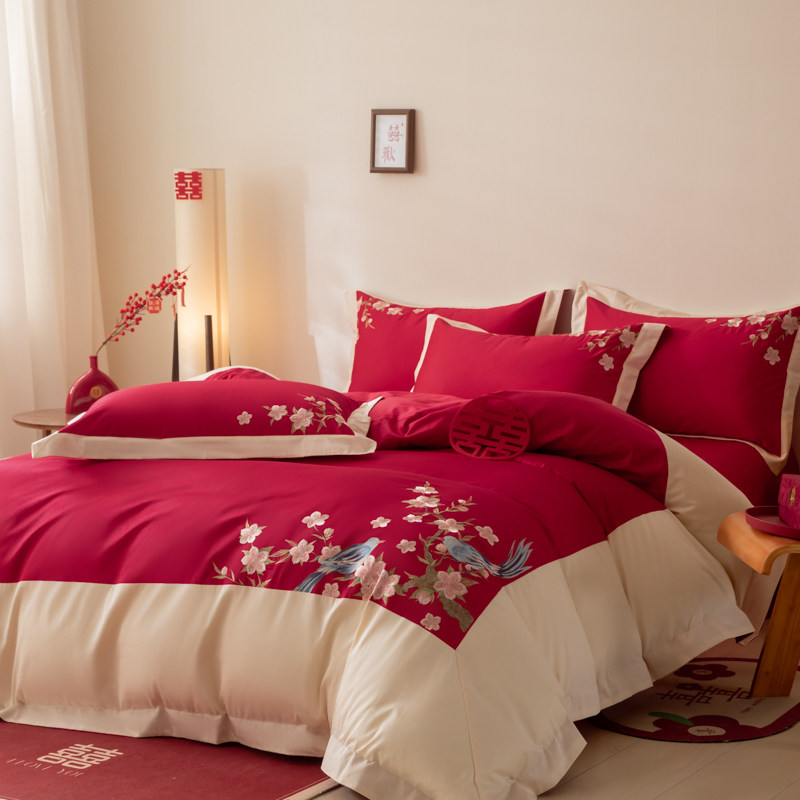 新中式轻奢纯棉结婚床上四件套红色全棉陪嫁喜被婚庆喜庆床单床笠