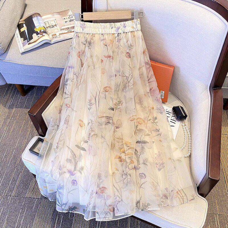 雪纺印花半身裙女春季浪漫印花中长款散花大摆时尚仙气A字裙女潮