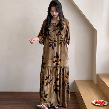 2025新款睡裙女春夏季棉绸口袋长裙方领方领脚踝宽松大码家居服薄