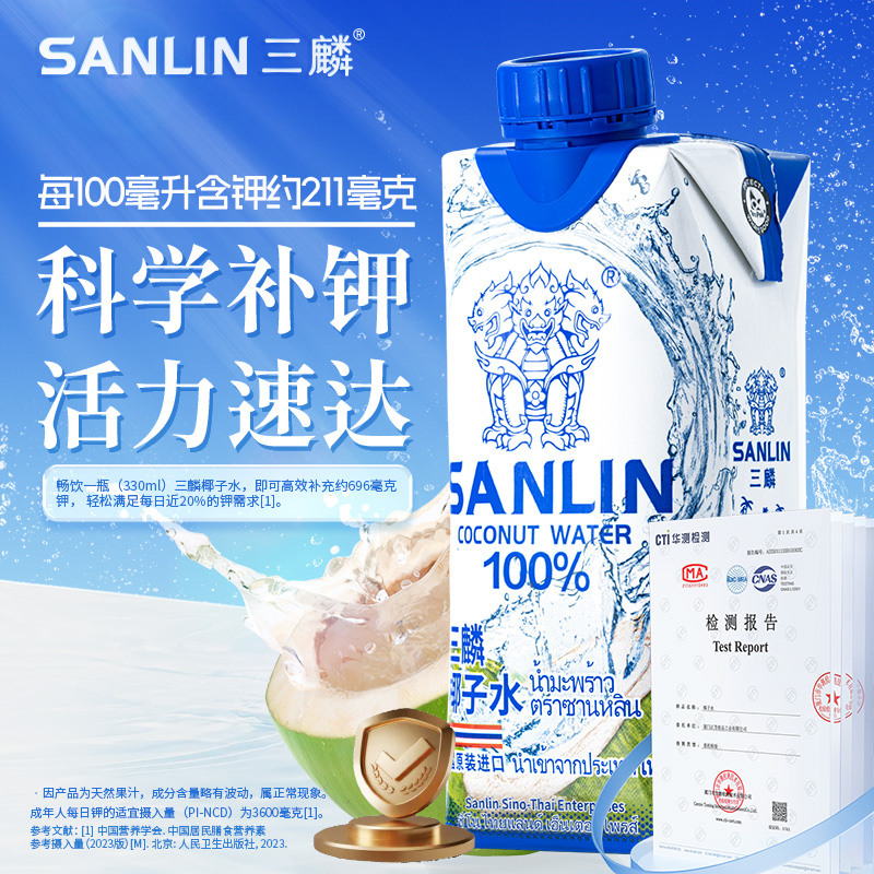 三麟100%椰子水富含天然电解质泰国进口NFC椰青果汁330ml*12瓶
