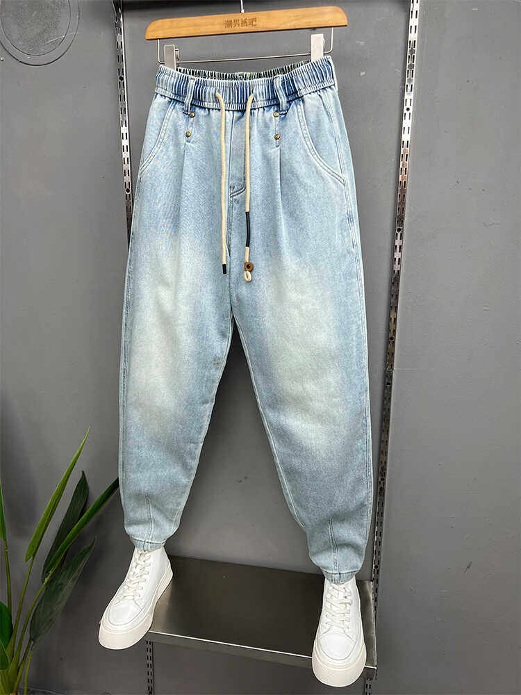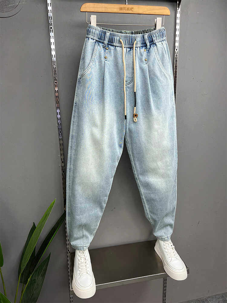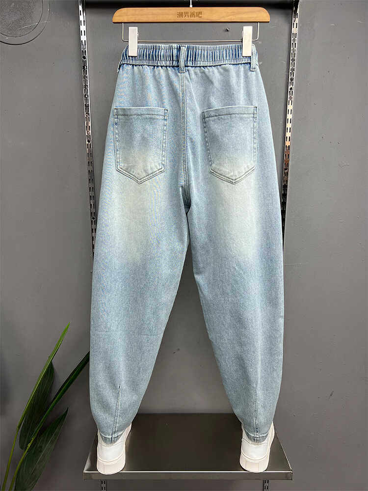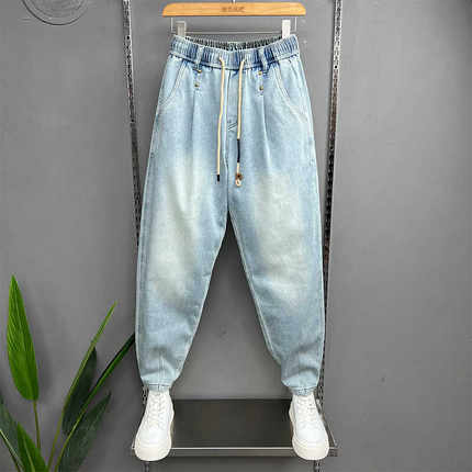 美式宽松小脚牛仔裤男士春季新款浅蓝色弹力柔软哈伦裤潮流萝卜裤