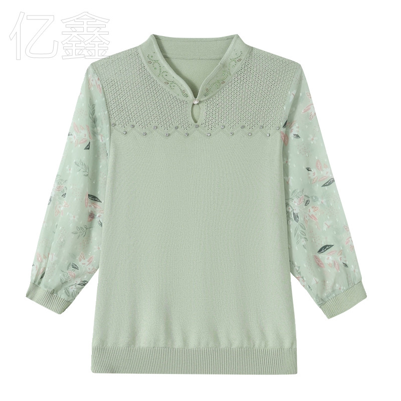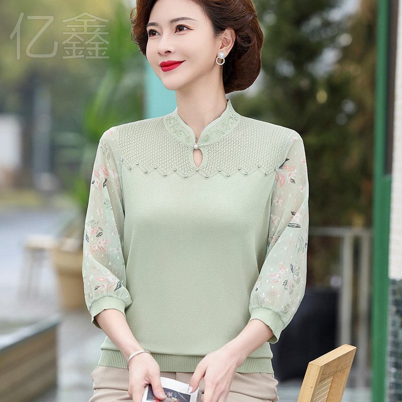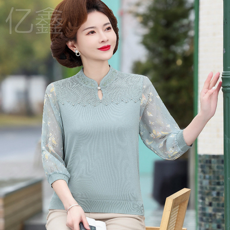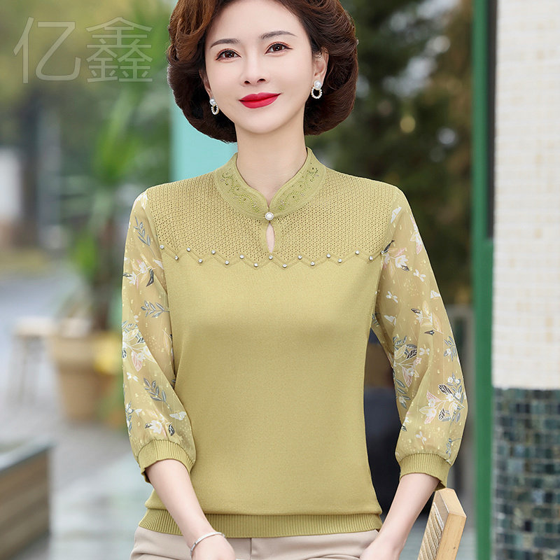 妈妈春装薄款纱袖打底上衣中老年女春秋新款针织长袖T恤冰丝小衫