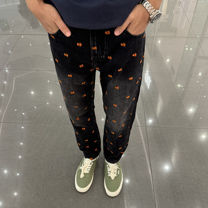 秋冬九分牛仔裤男士直筒桃心刺绣