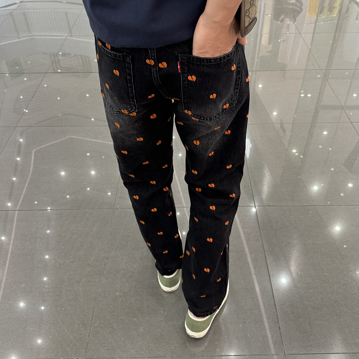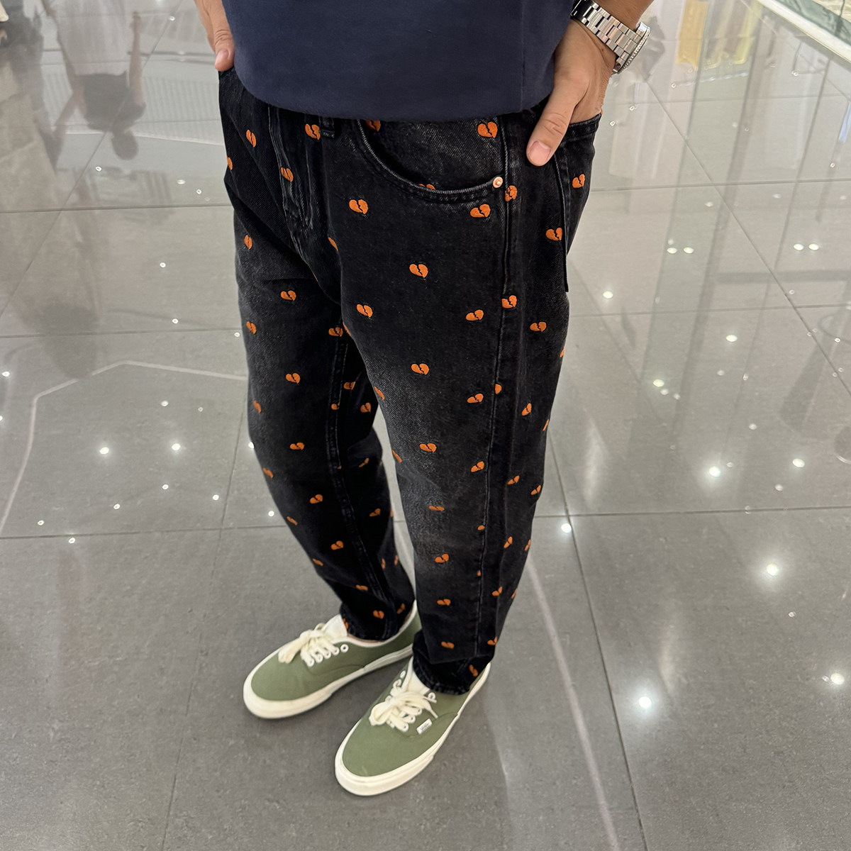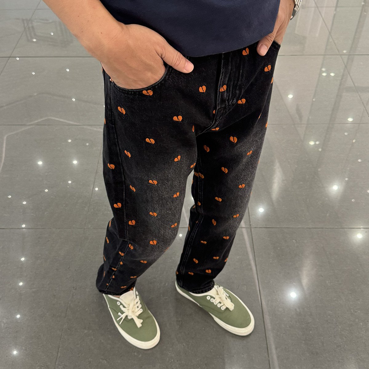 秋冬九分牛仔裤男士宽松直筒洗水黑色时尚潮流桃心刺绣9分裤纯棉