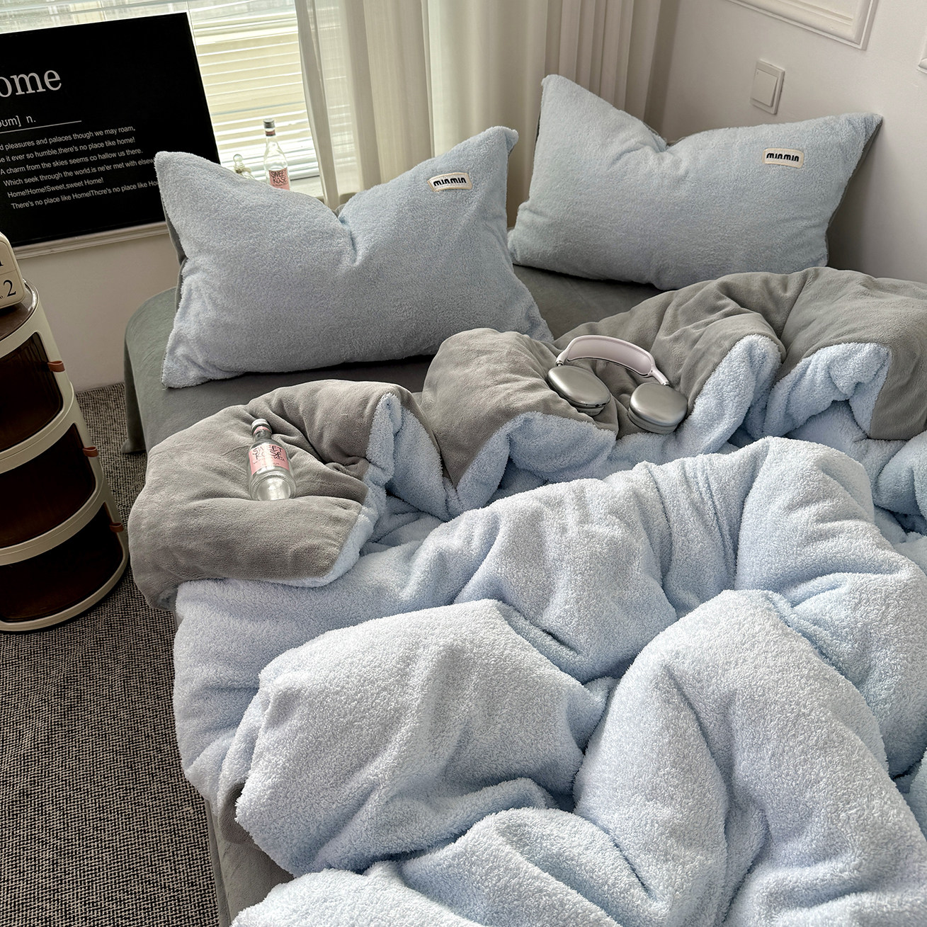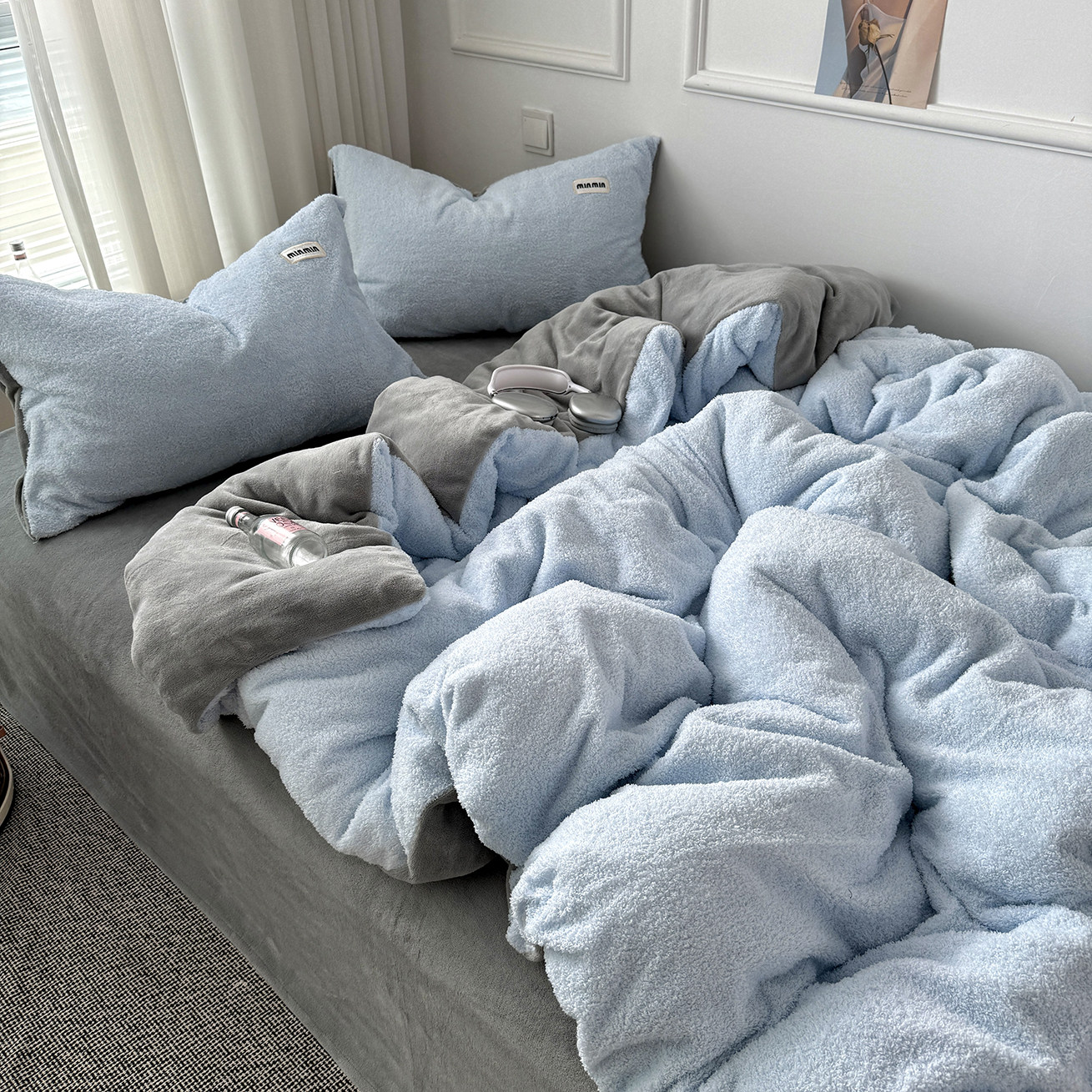 ins冬季舒适蓝灰色泰迪绒四件套加厚保暖珊瑚绒牛奶绒被套三件套