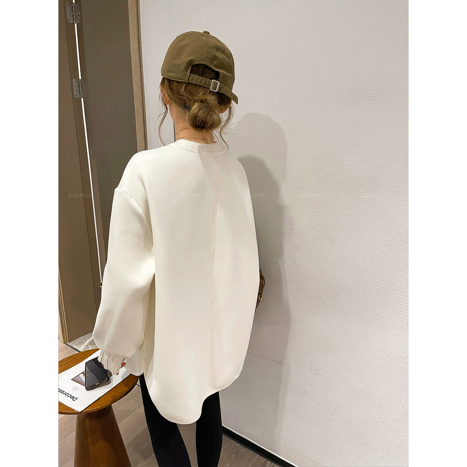 爱情魔鬼鱼 白色圆领中长款套头卫衣女2025秋季新款宽松休闲上衣
