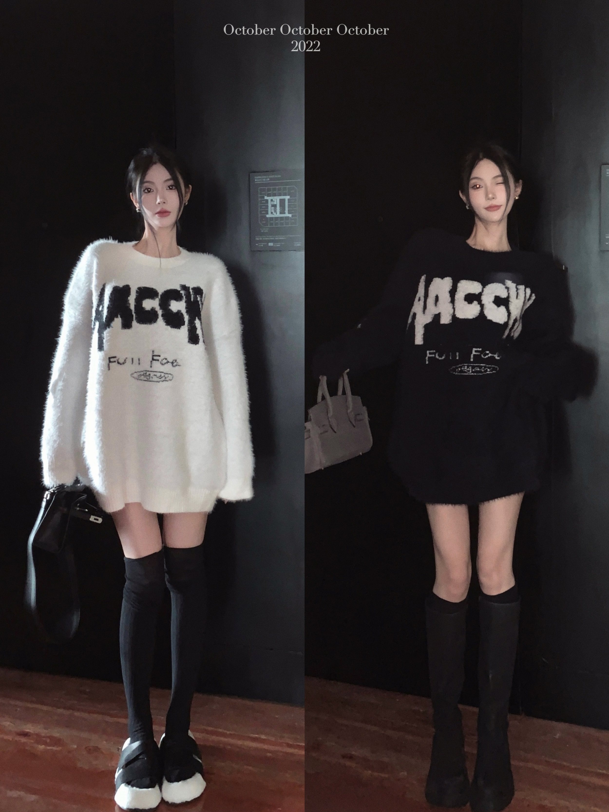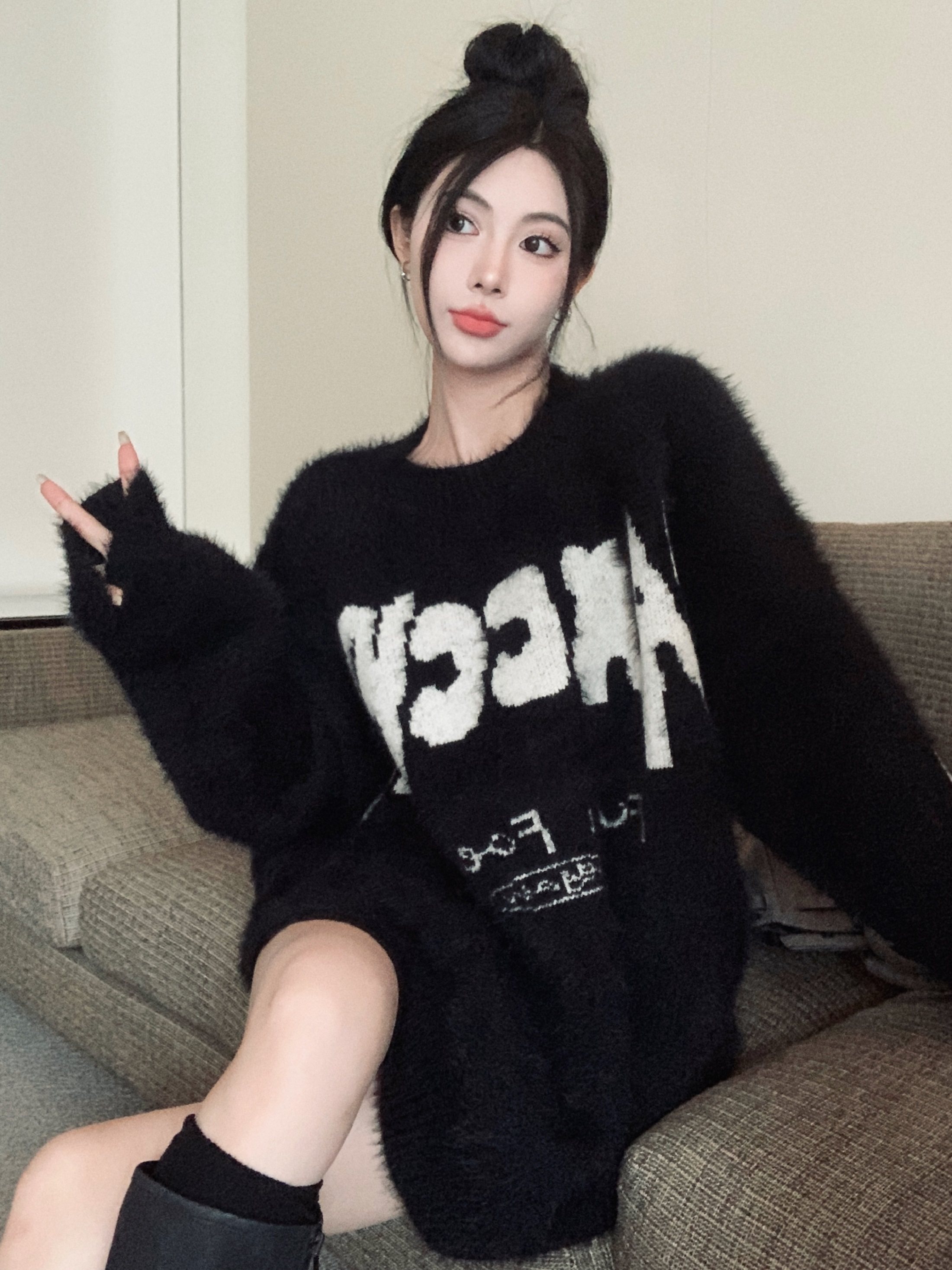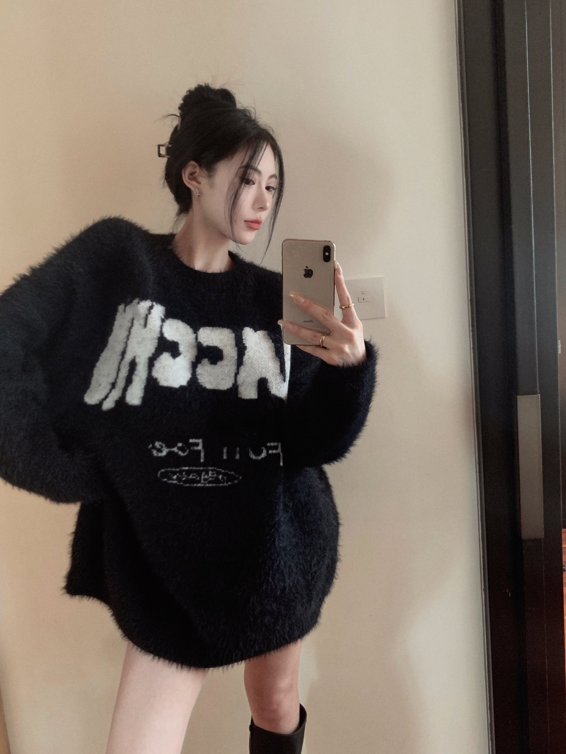 套头圆领水貂绒毛衣女冬季宽松慵懒风中长款高级感复古针织衫上衣