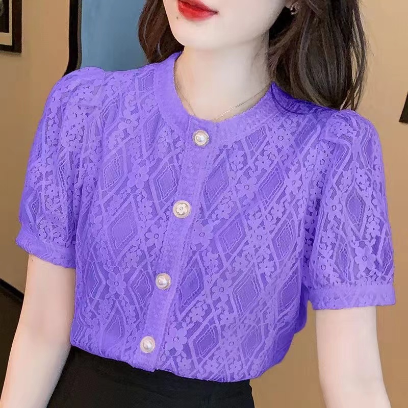 蕾丝短袖雪纺衬衫女2024夏季新款圆领设计感小众法式洋气上衣潮