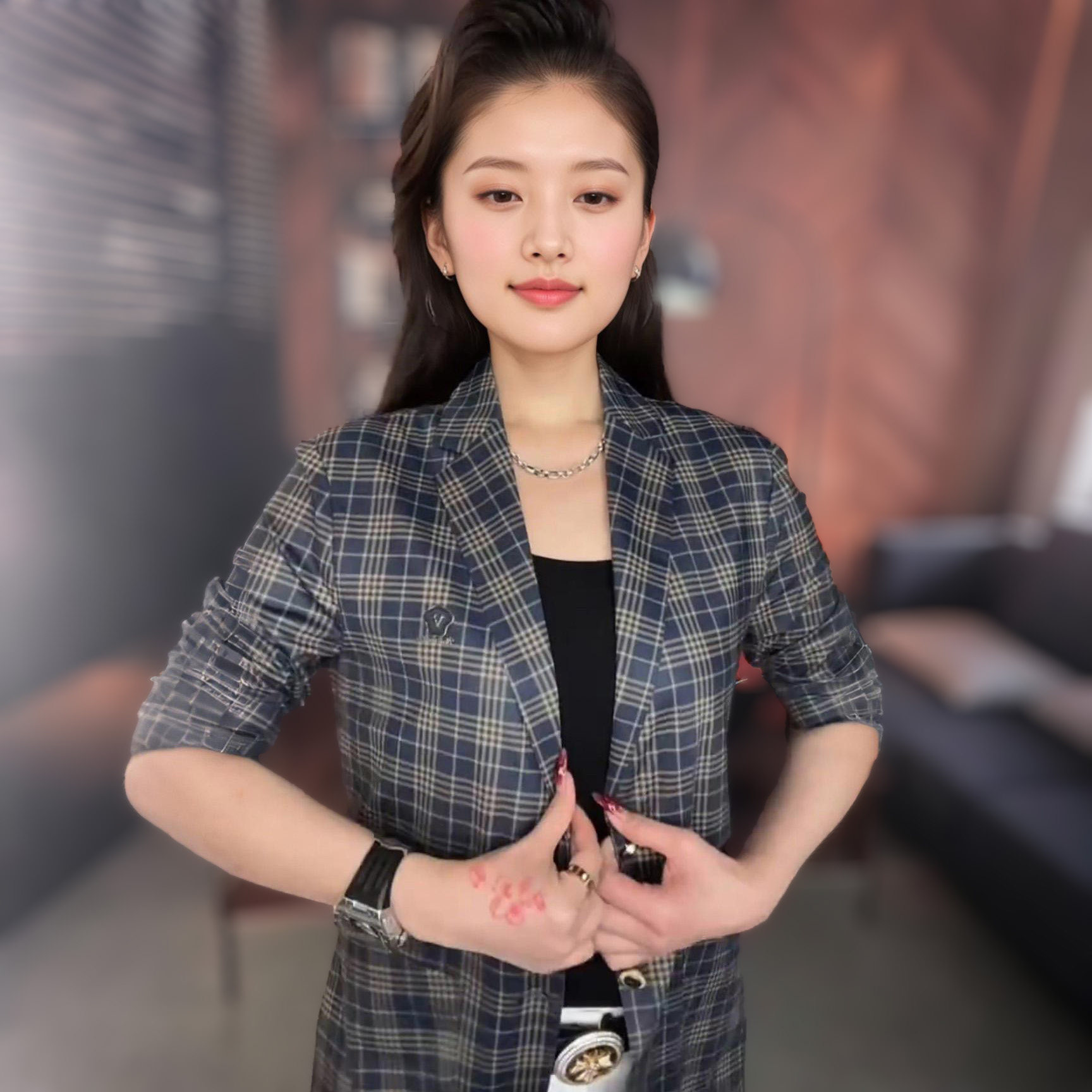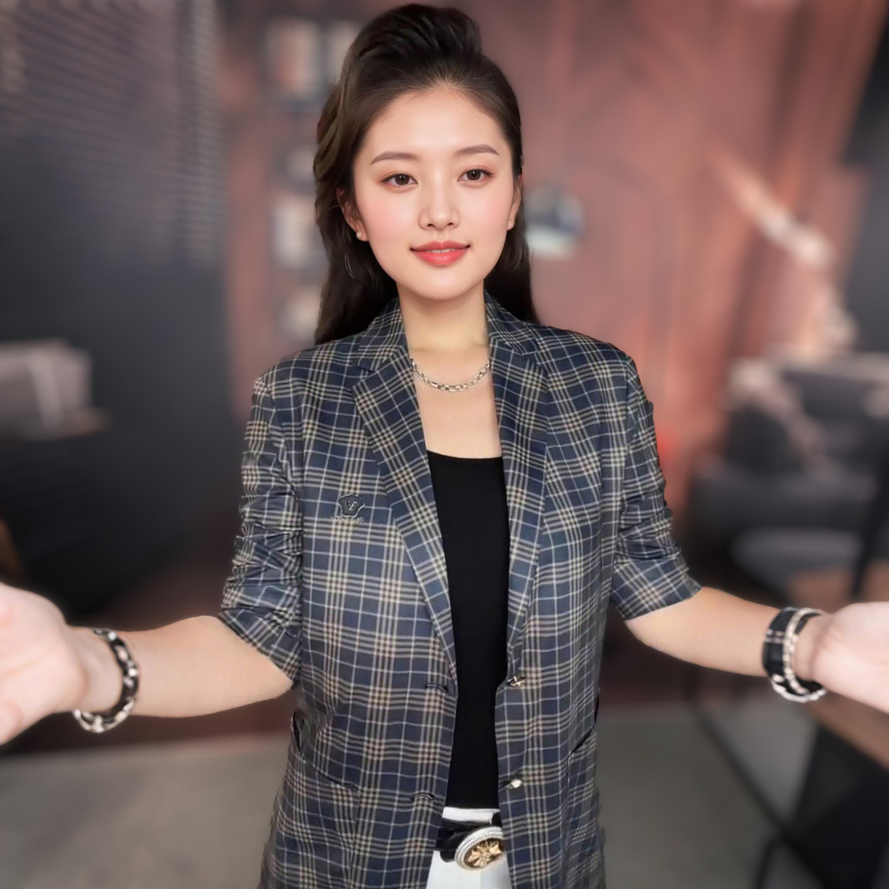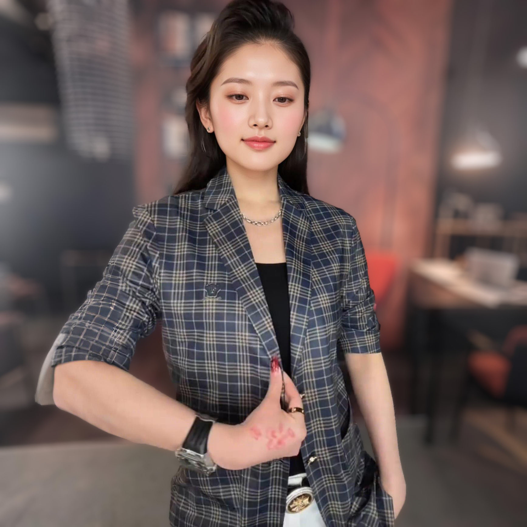 【双男装】男士时尚个性百搭格纹水洗修身上衣小西服长袖小便西