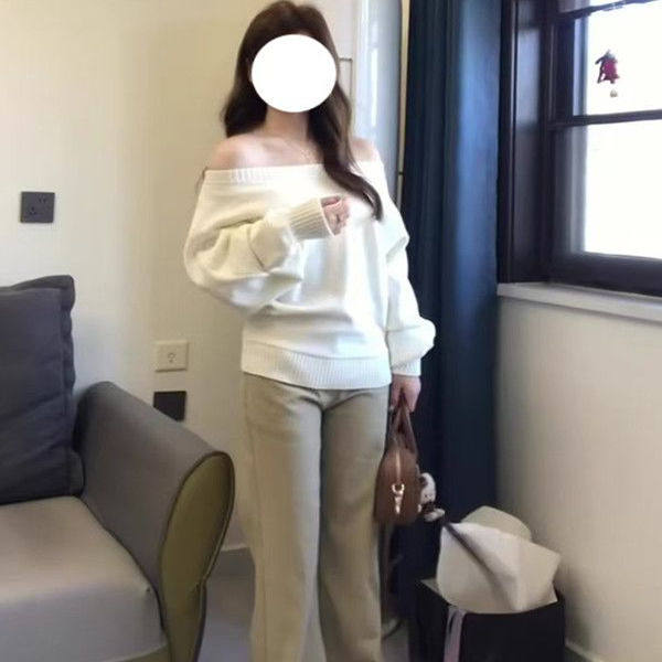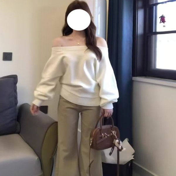 白色一字肩长袖慵懒显瘦毛衣女