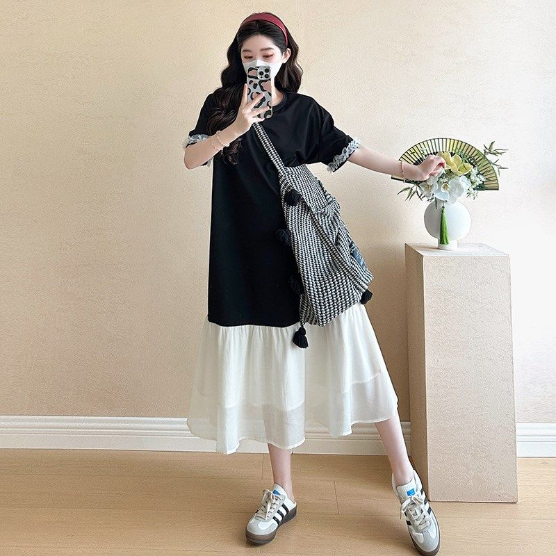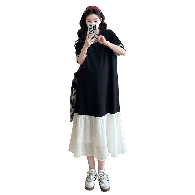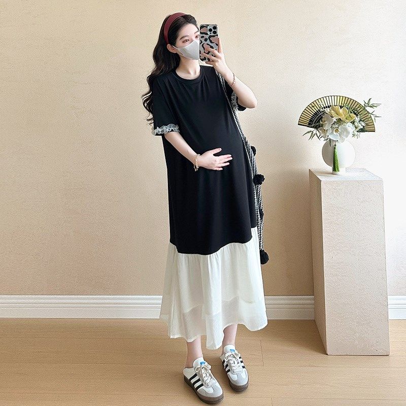 孕妇装2025夏装新款韩版时尚洋气显瘦拼接中长款圆领短袖连衣裙女