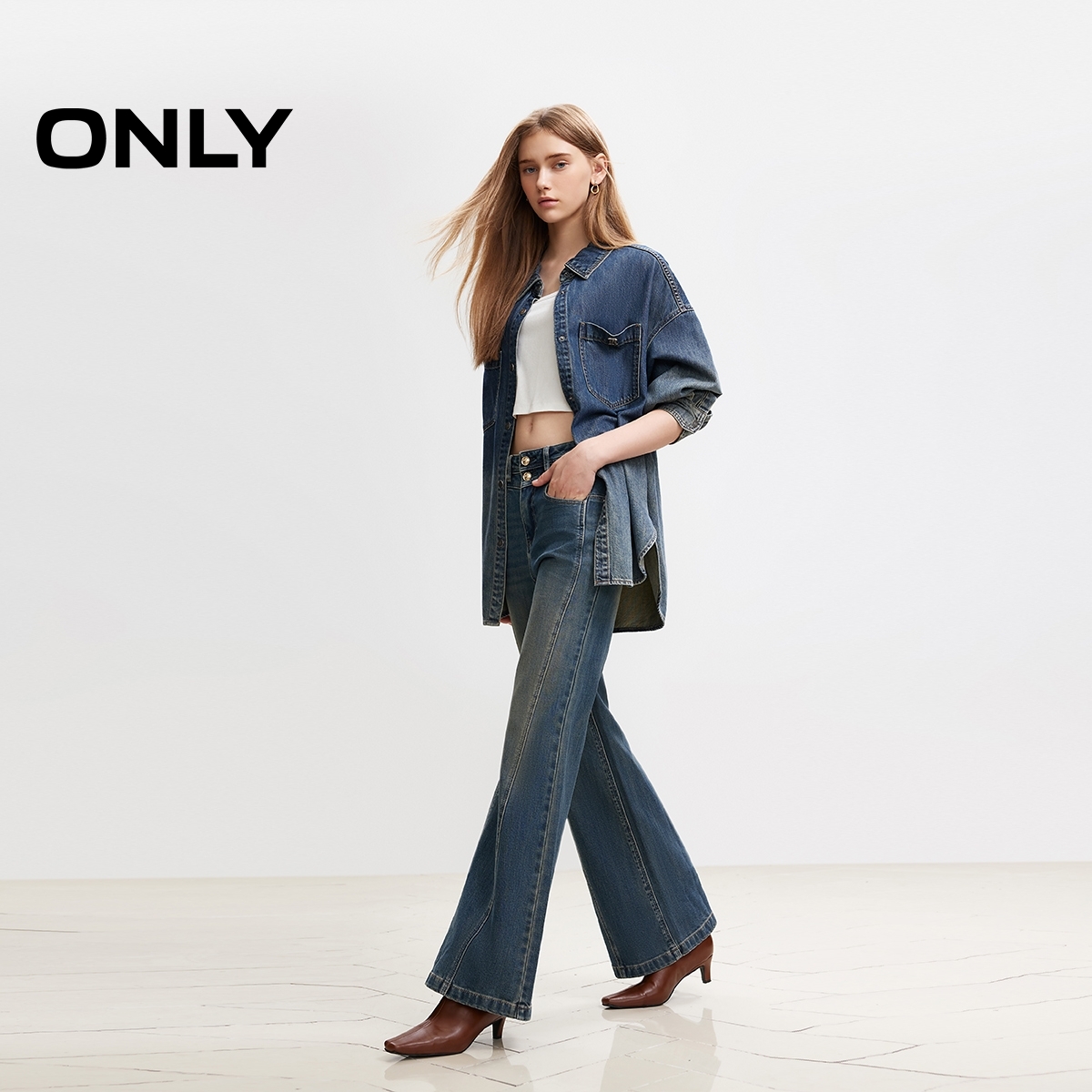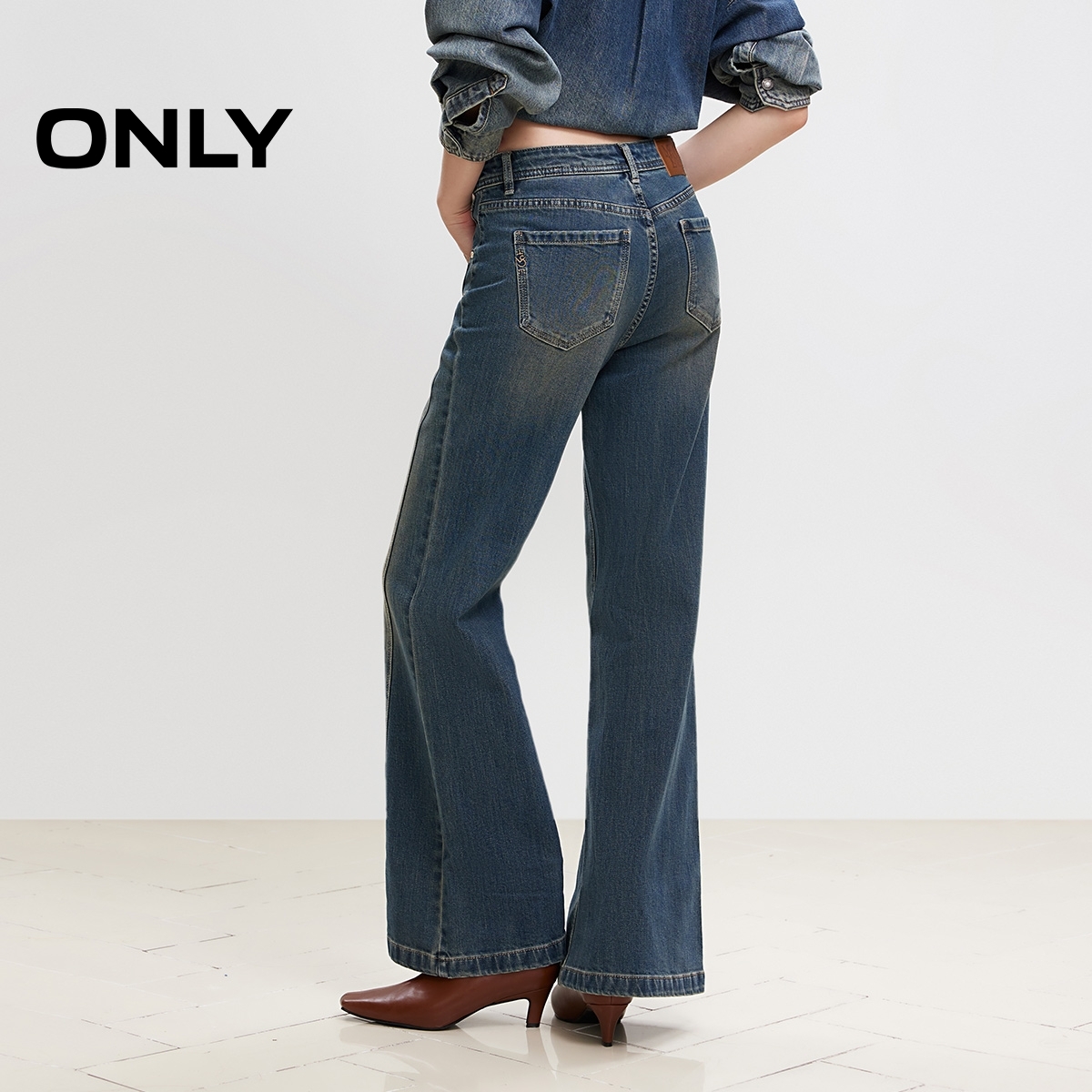 ONLY复古做旧高腰微喇长裤牛仔裤