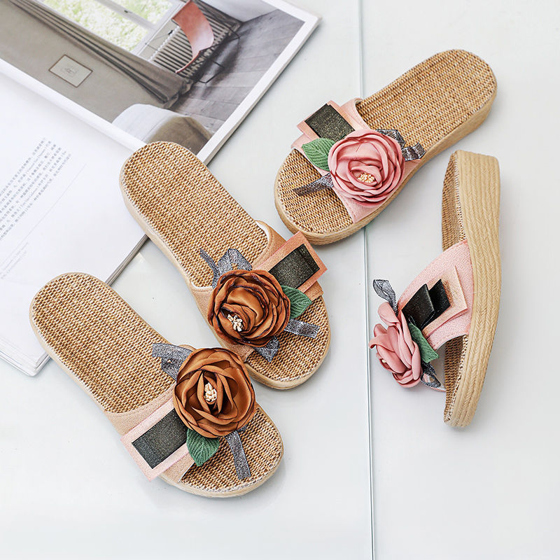夏季坡跟甜美设计感花朵凉拖鞋女士亚麻显瘦增高厚底轻便家用外穿