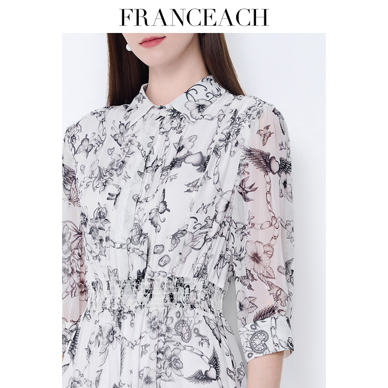 法涵意弛印花真丝连衣裙女2025夏新款松紧收腰桑蚕丝衬衫式碎花裙