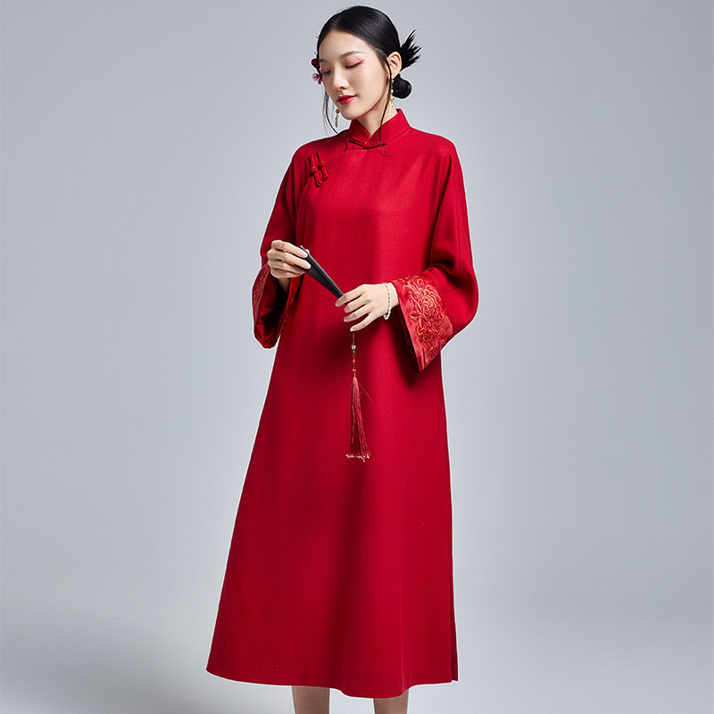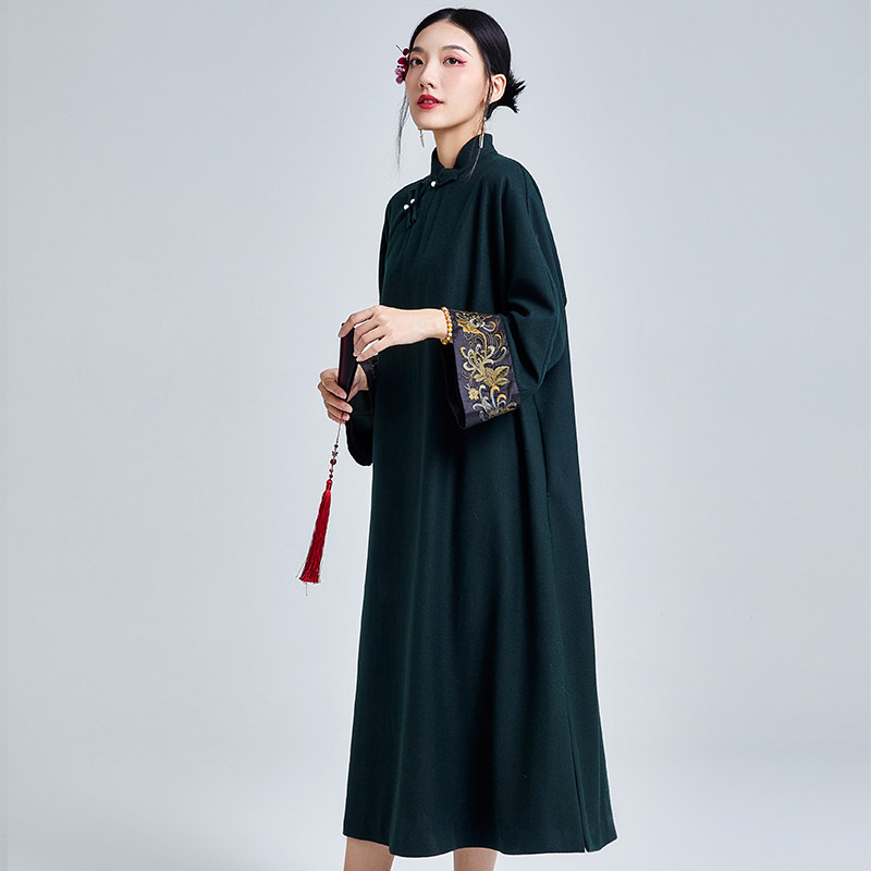 陌遇2025冬季新款中国风复古刺绣茶服女宽松改良旗袍羊毛呢连衣裙