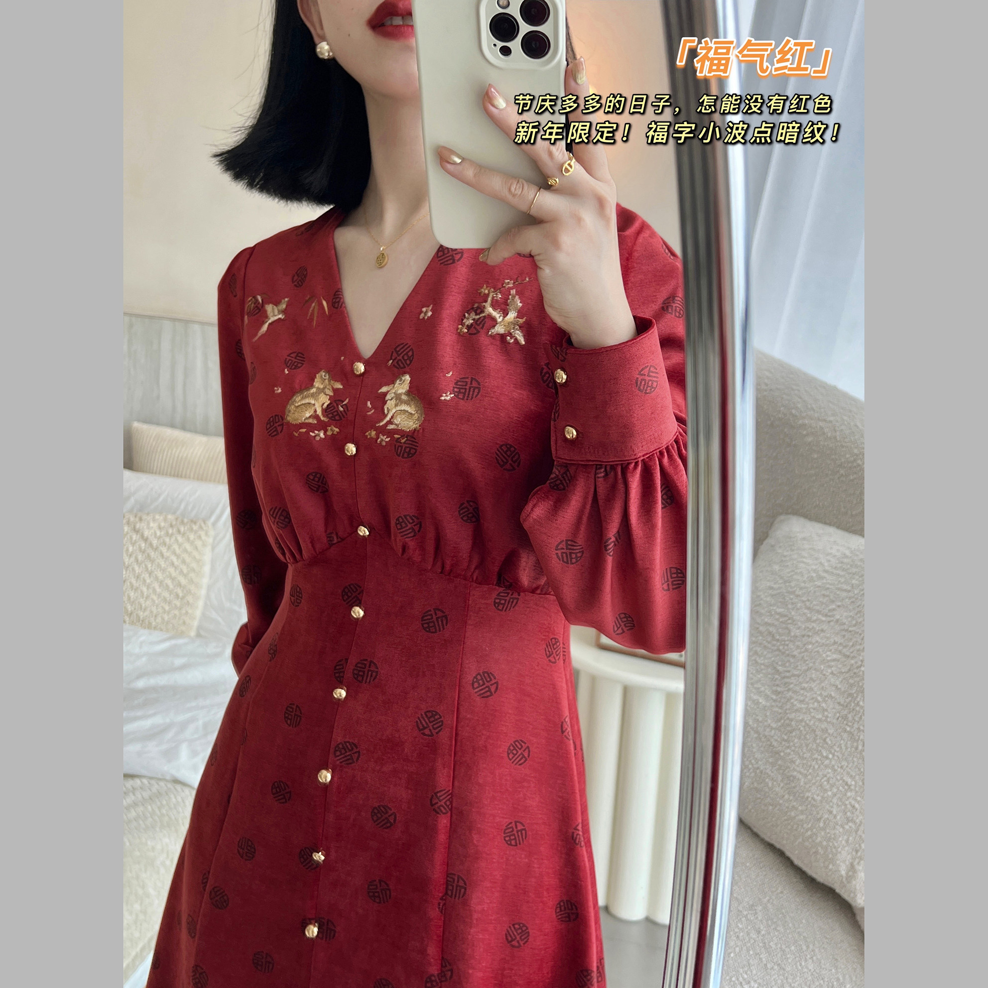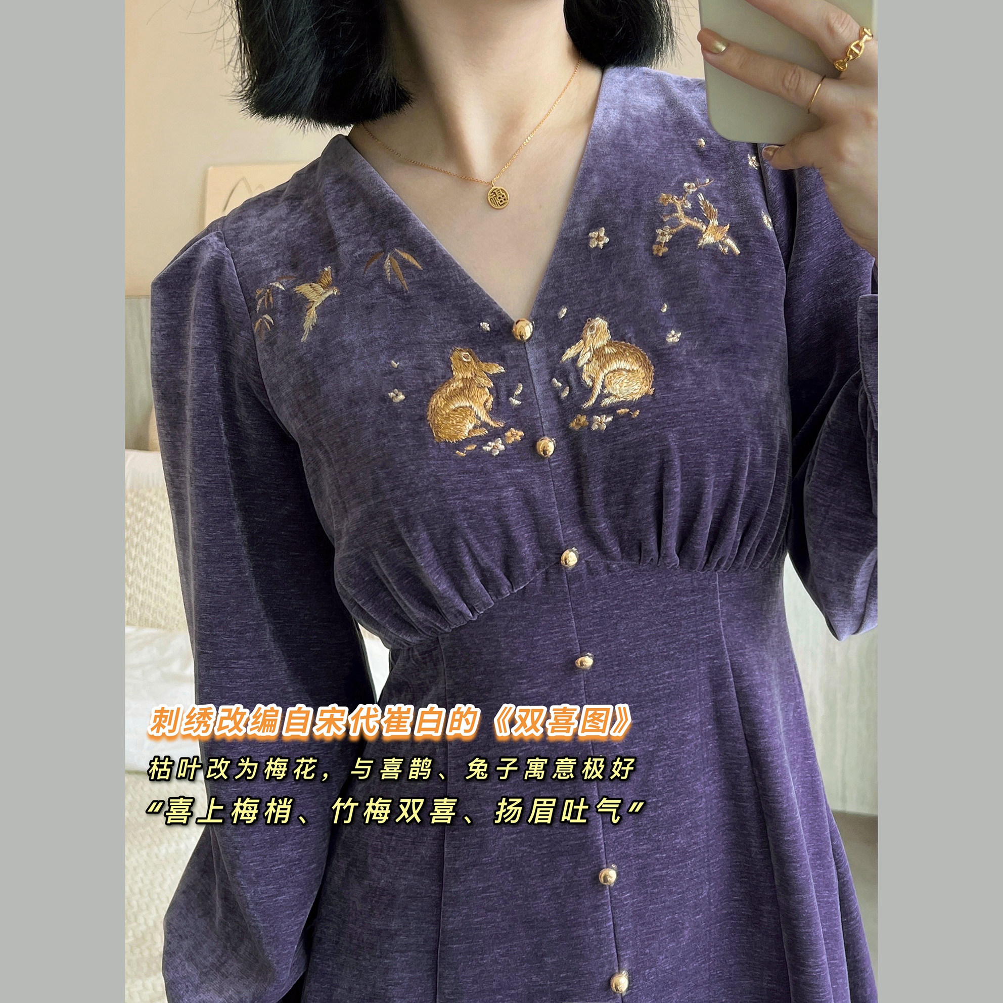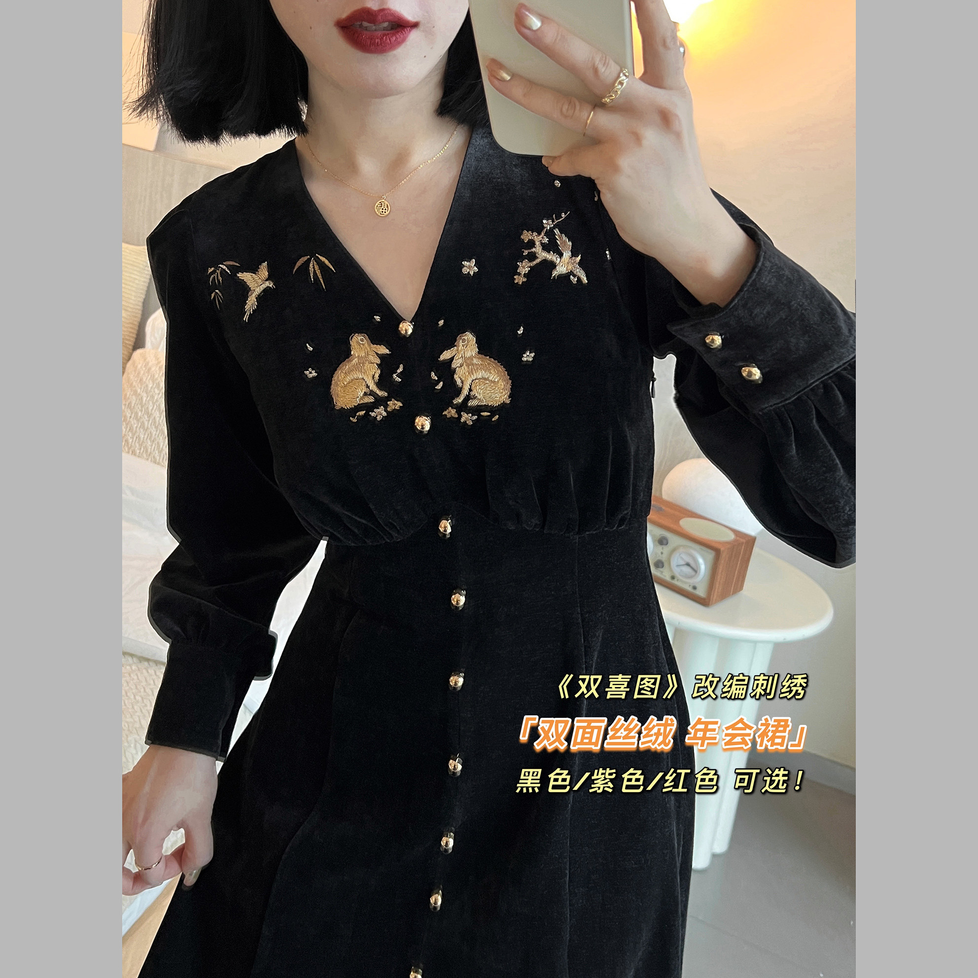 【双喜宴】秋冬连衣裙丝绒2023新款长袖刺绣裙子中国风女装长裙厚