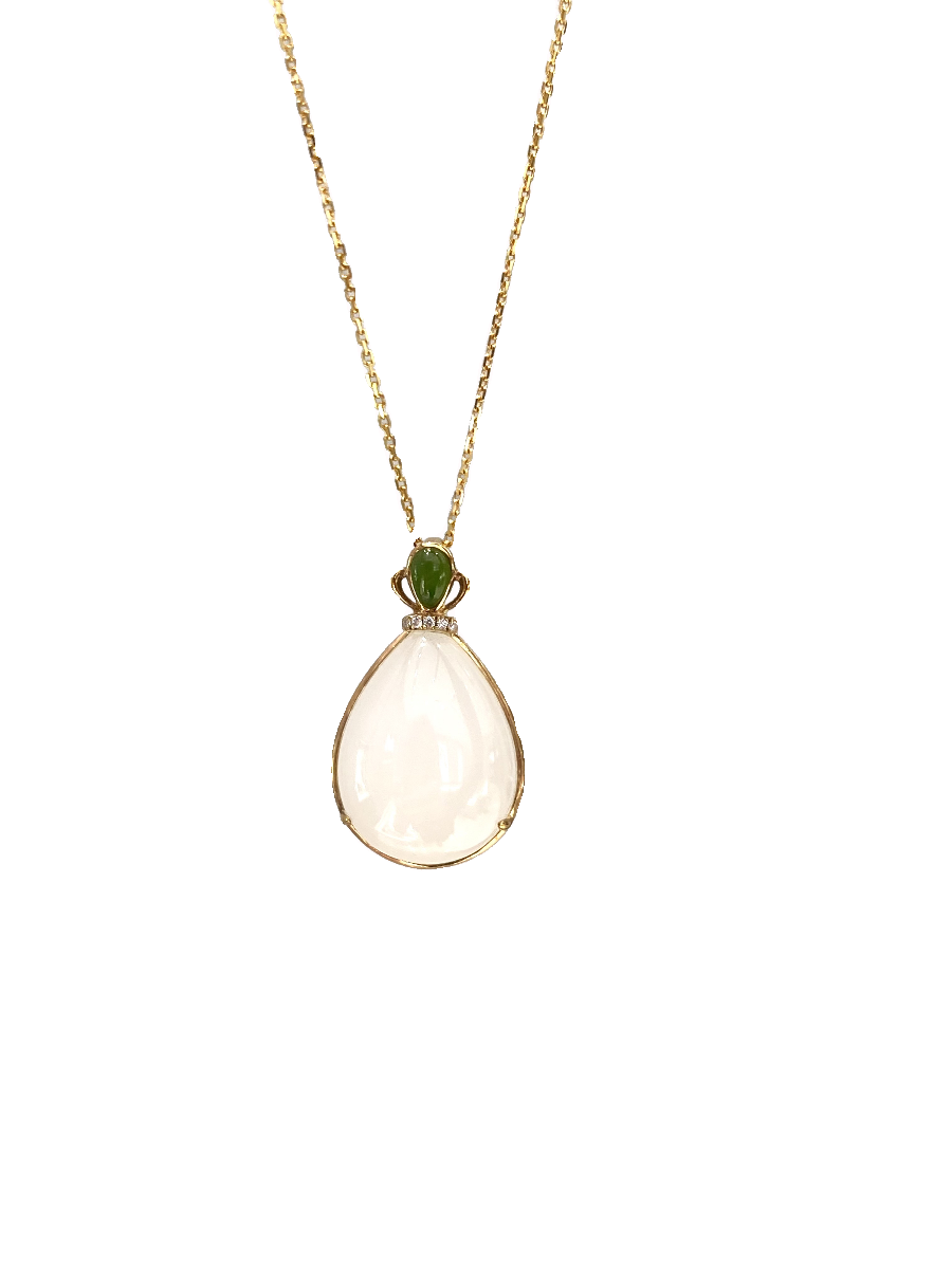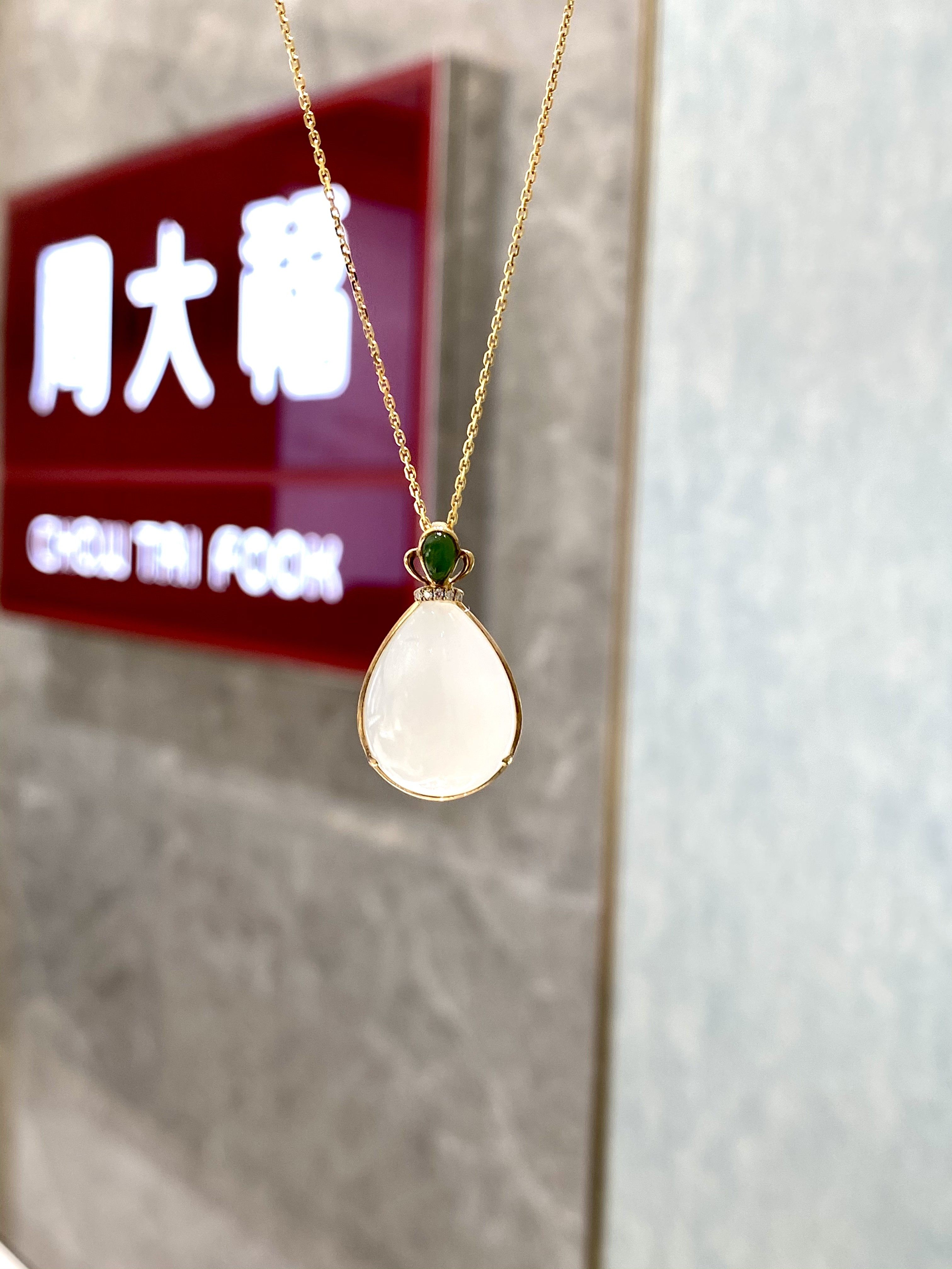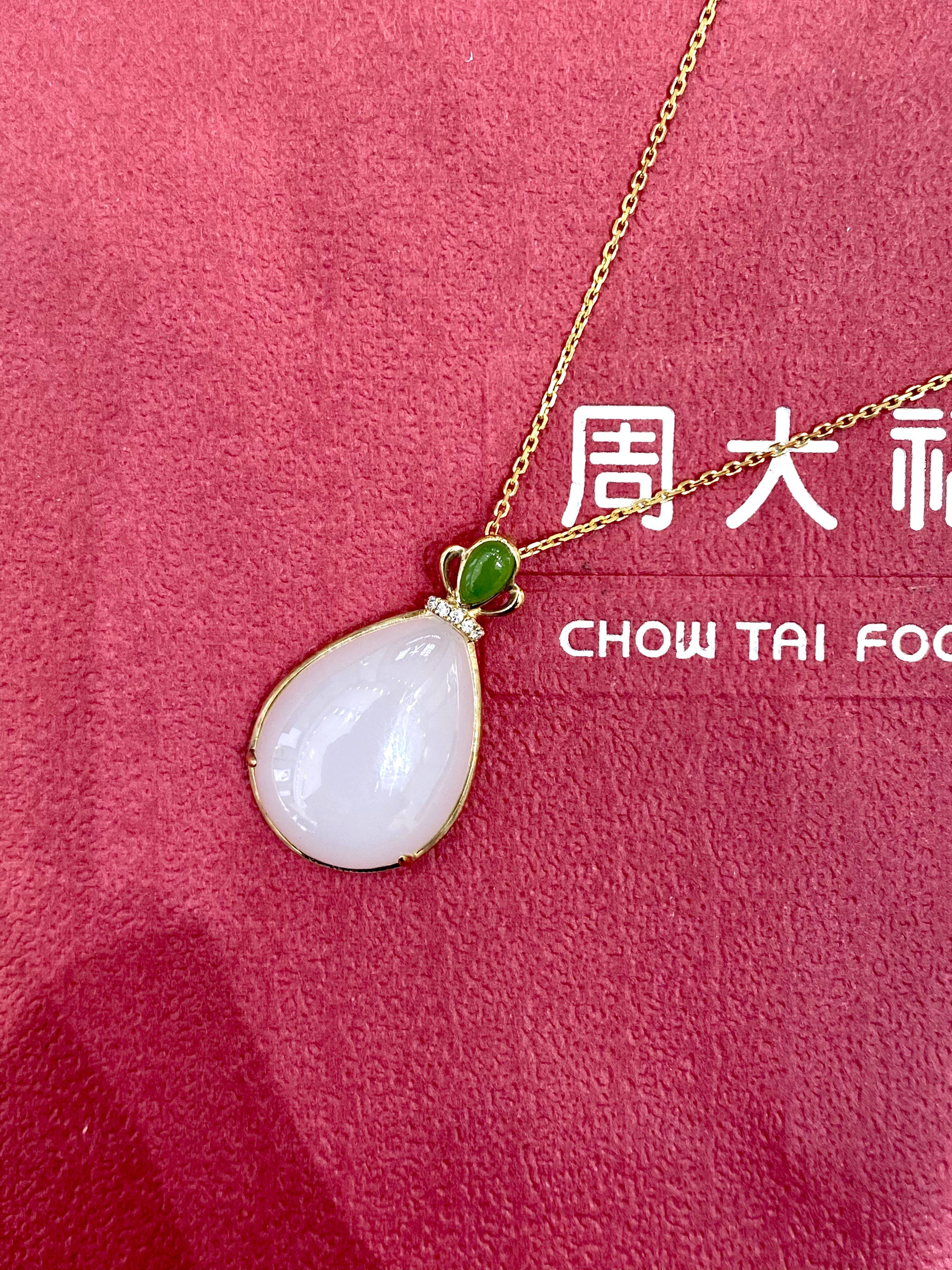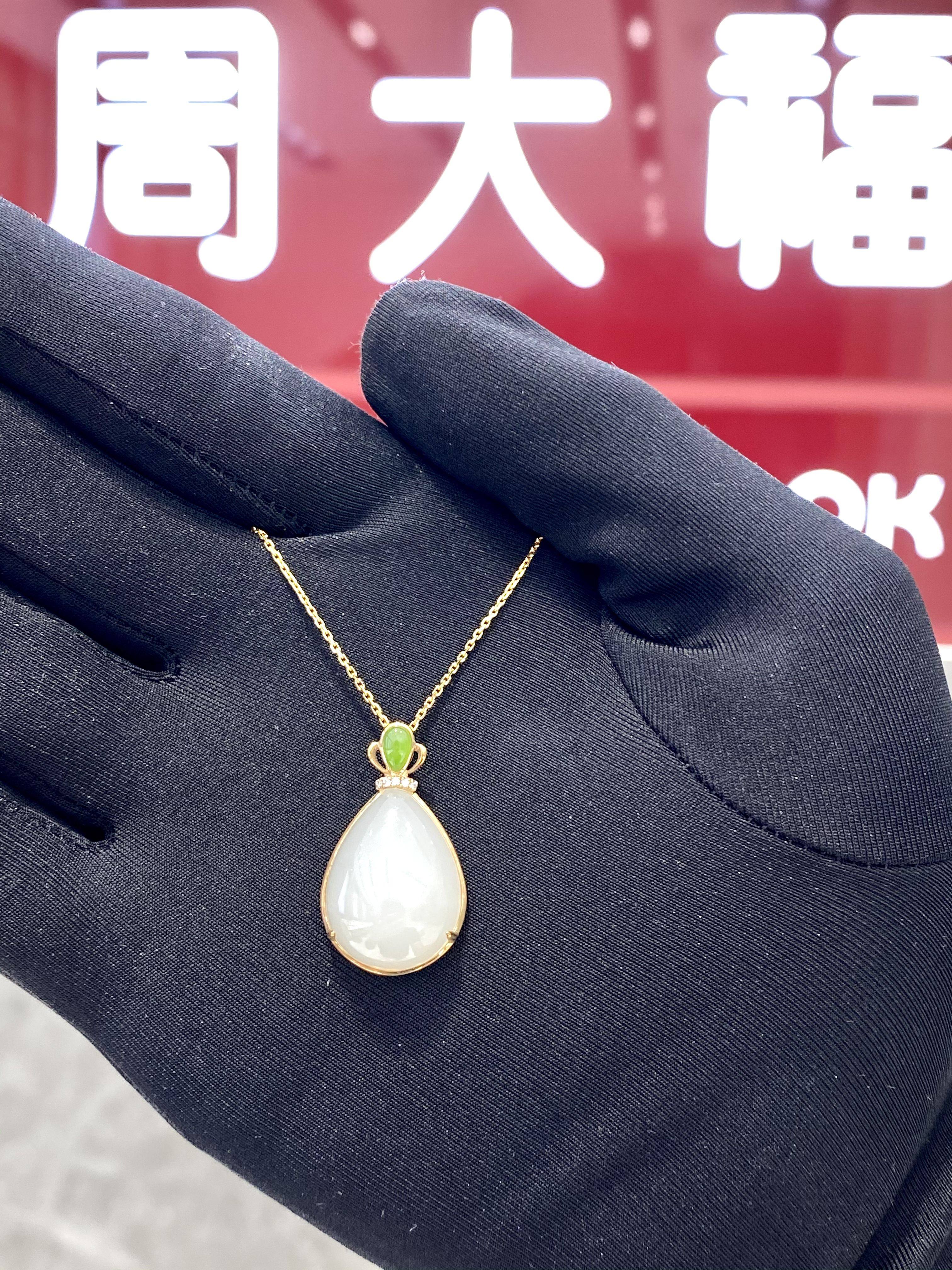 周大福代购 国玉传承18K金镶玉水滴吊坠 18K金钻石项链正品7折