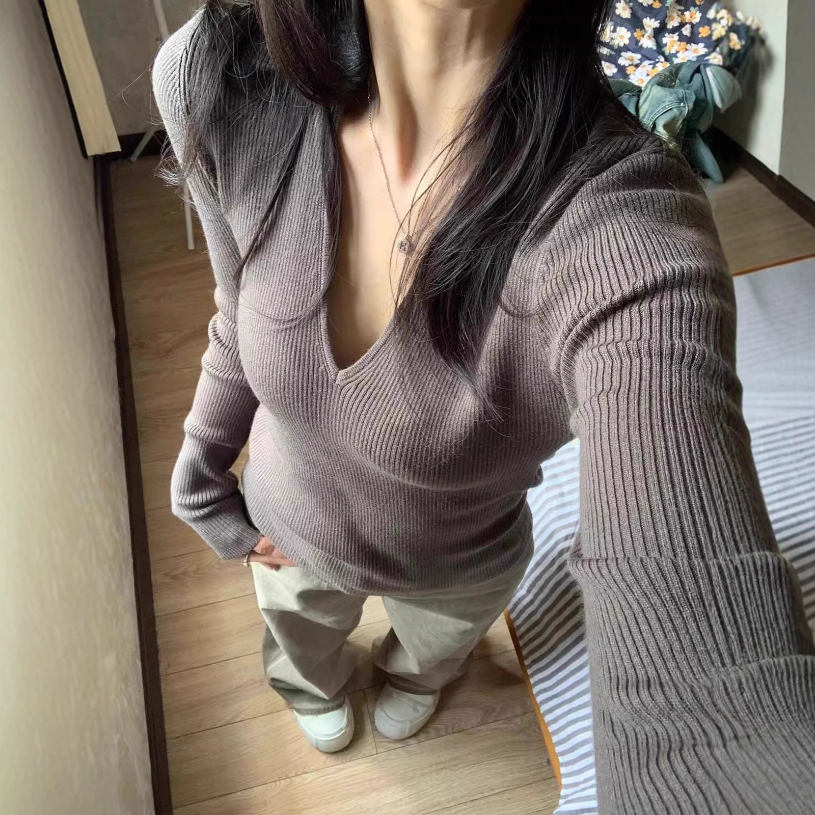 纯色v领针织打底衫女秋冬新款内搭毛衣纯欲修身显瘦百搭长袖上衣