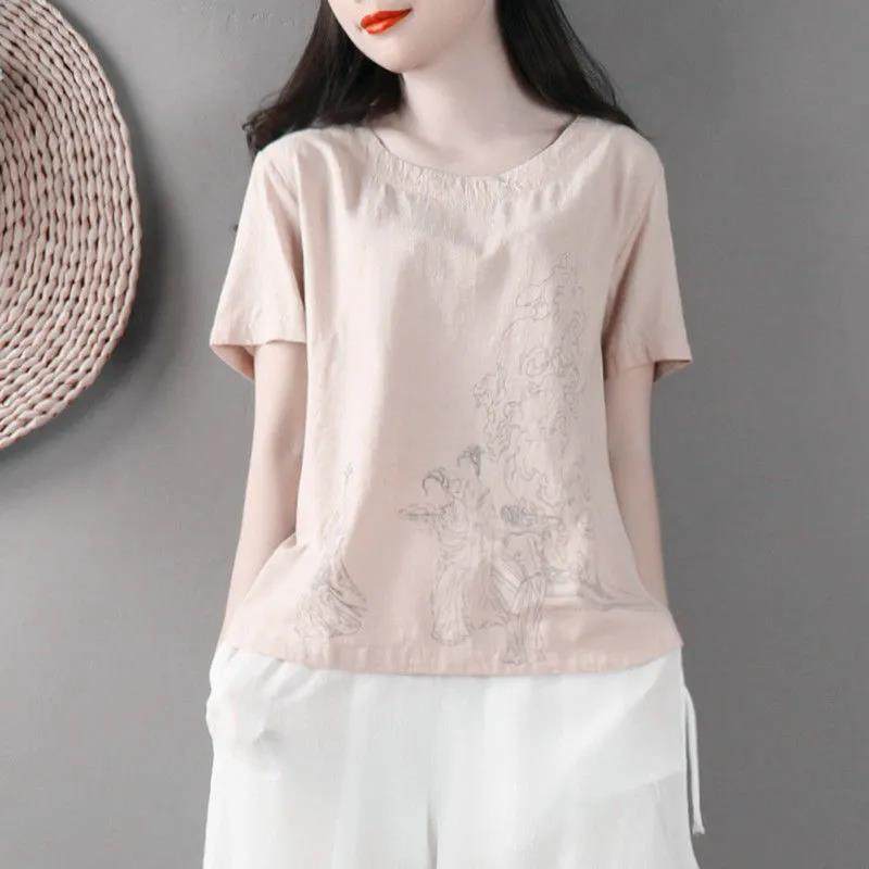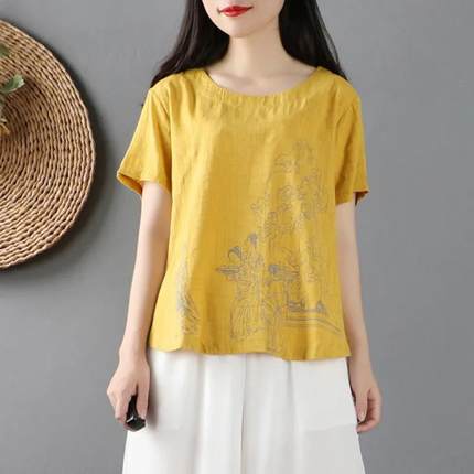 夏季大码亚麻小衫胖妹妹宽松薄款棉麻印花T恤中长款短袖休闲上衣