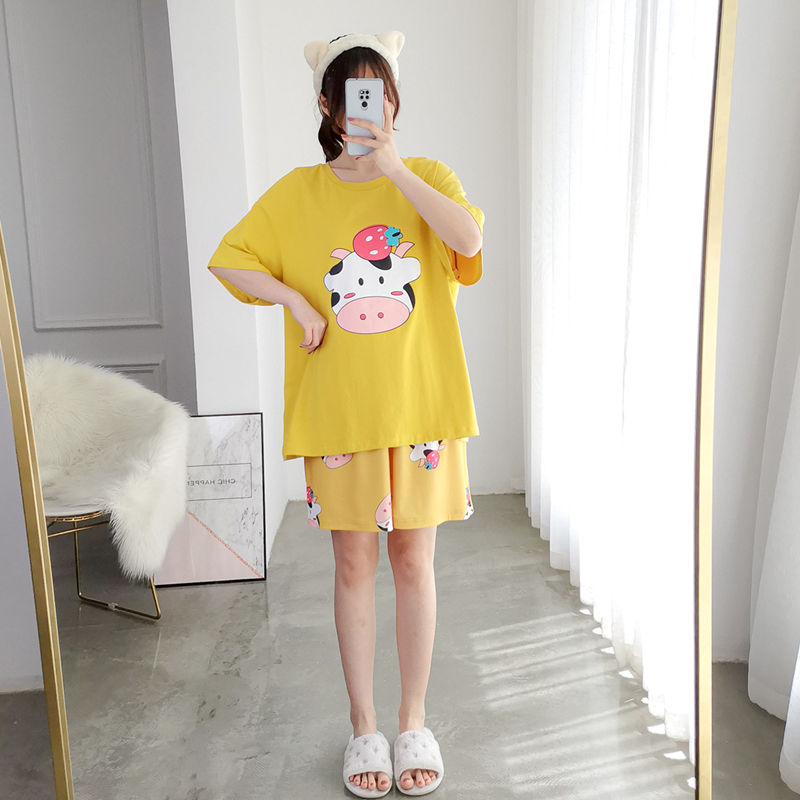 夏季清新奶牛纯棉睡衣女可爱短袖短裤加大码两件套胖mm宽松家居服
