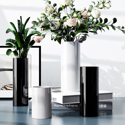 简约黑白色直筒圆口玻璃花瓶落地水培插花花瓶酒店样板房装饰摆件