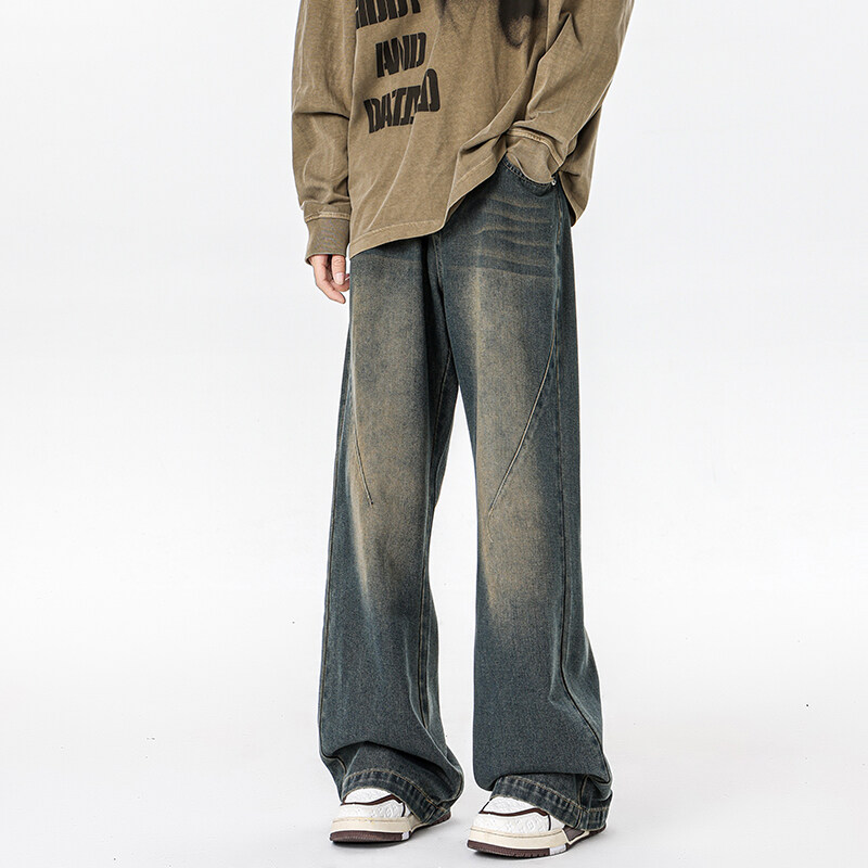 美式高街复古做旧渐变秋季牛仔裤男宽松阔腿高个子加长版直筒裤子