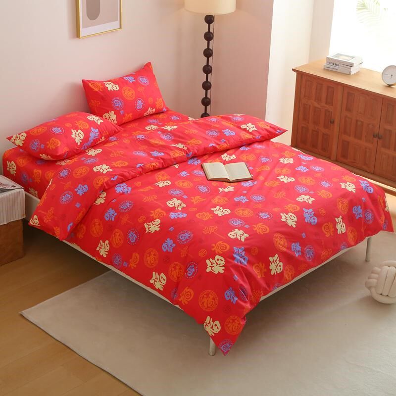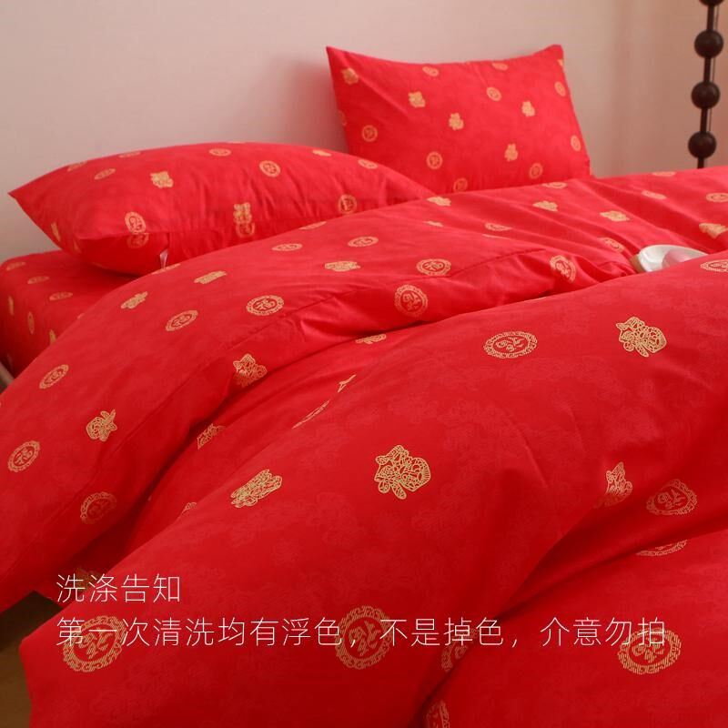 福到 床单被套四件套100全棉斜纹床品大红色V喜庆新年好婚房