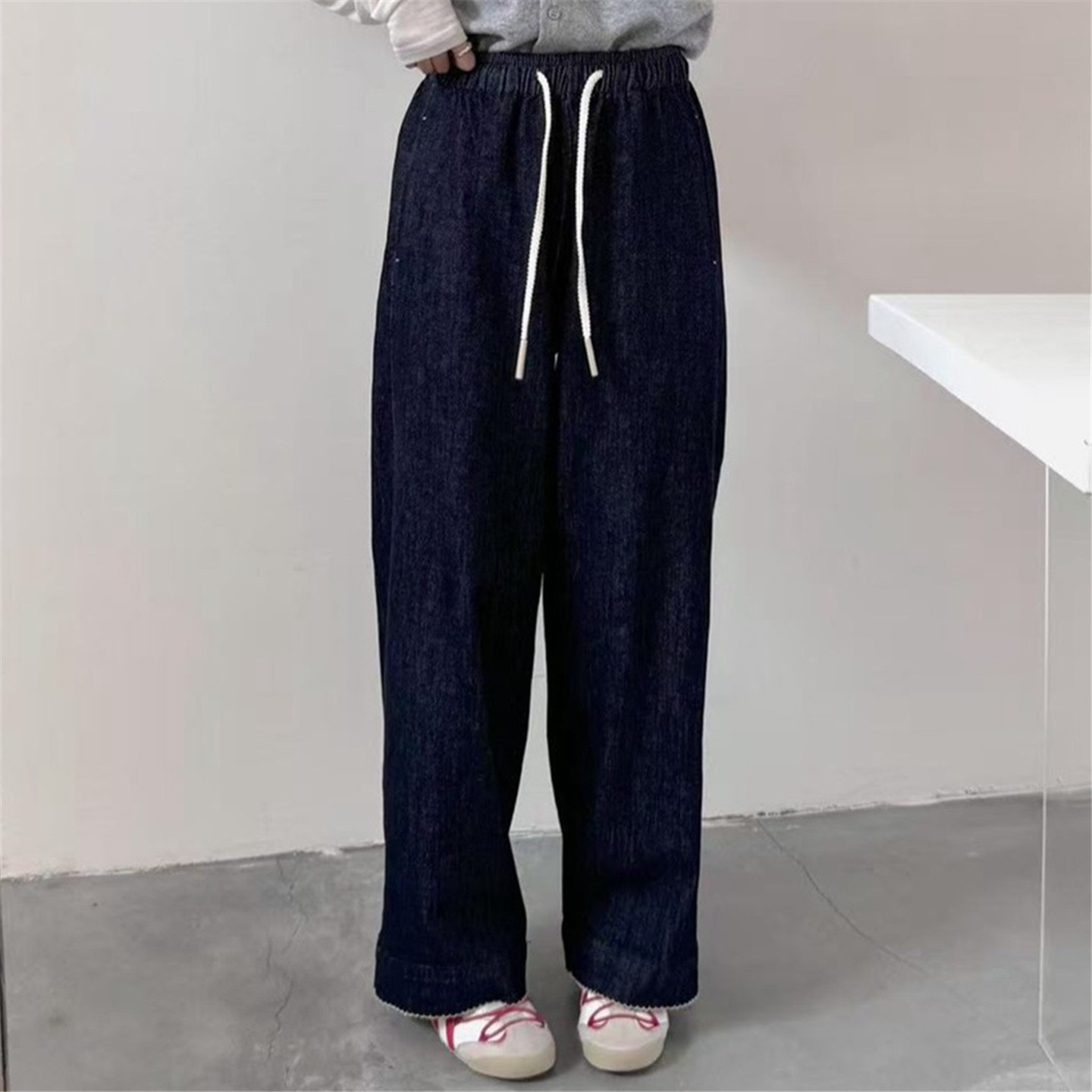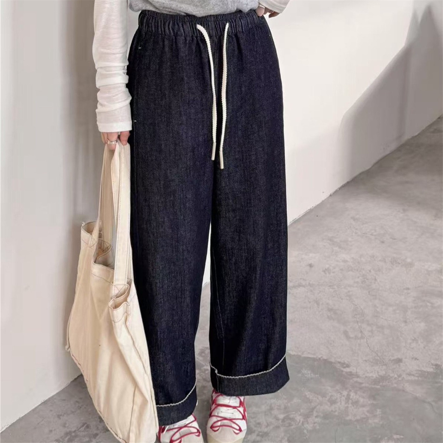 韩版松紧腰抽绳休闲牛仔裤女2025秋季新款纯色宽松显瘦柔软直筒裤
