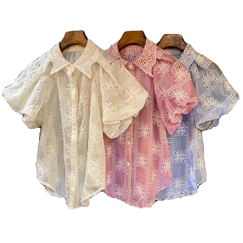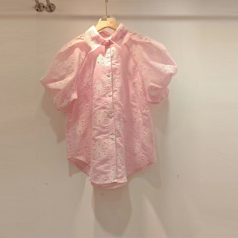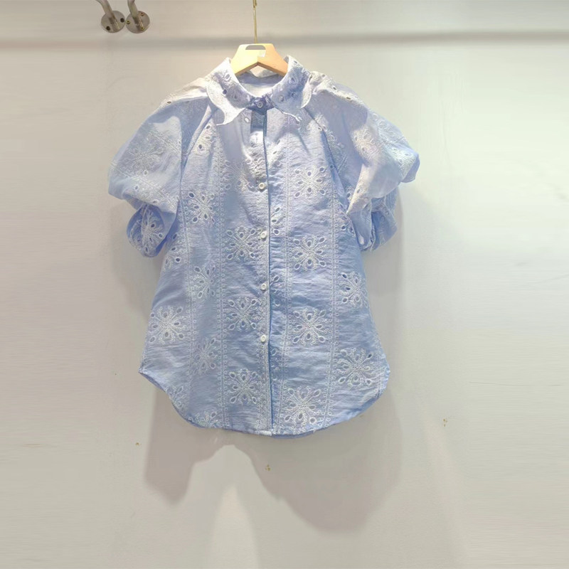 2026年早春新款欧货女装小翻领刺绣镂空泡泡短袖小众百搭衬衫