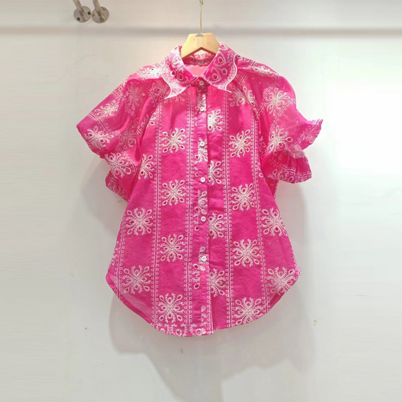 宽松百搭短袖雪纺刺绣镂空衬衫