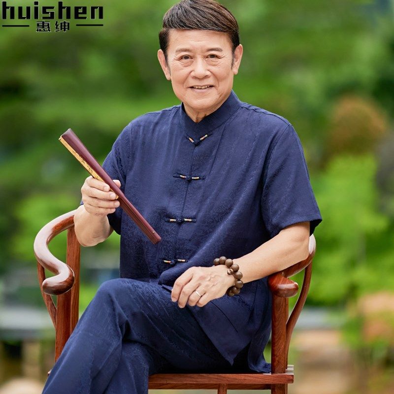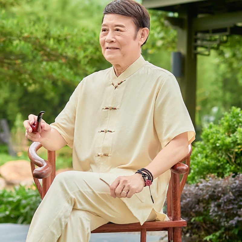 夏季唐装男衬衫短袖中老年人中山装爸爸套装爷爷夏装绵绸衣服男装