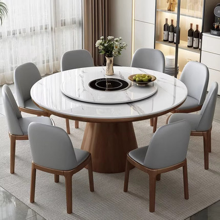 岩板圆型实木餐桌带转盘轻奢家用