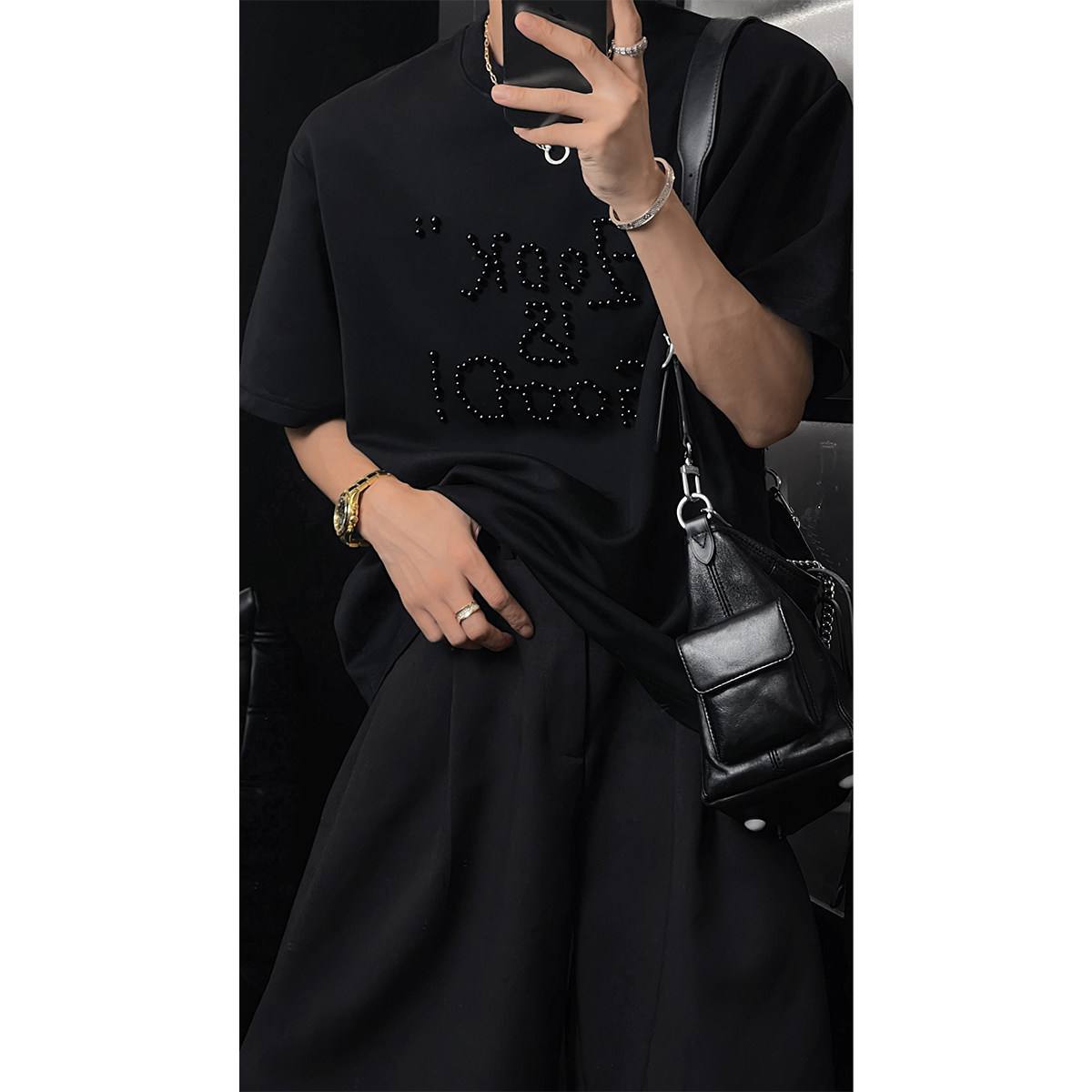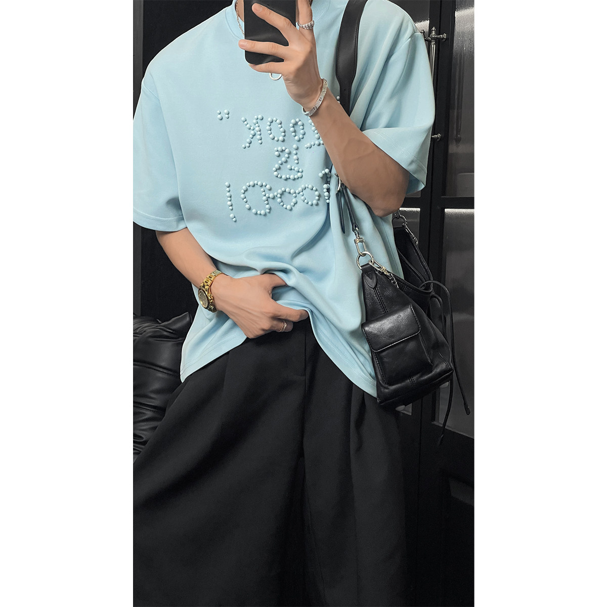 龙叨叨夏季新款潮流纯色高级感珍珠字母宽松百搭圆领短袖T恤
