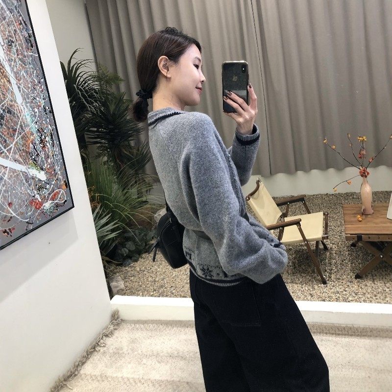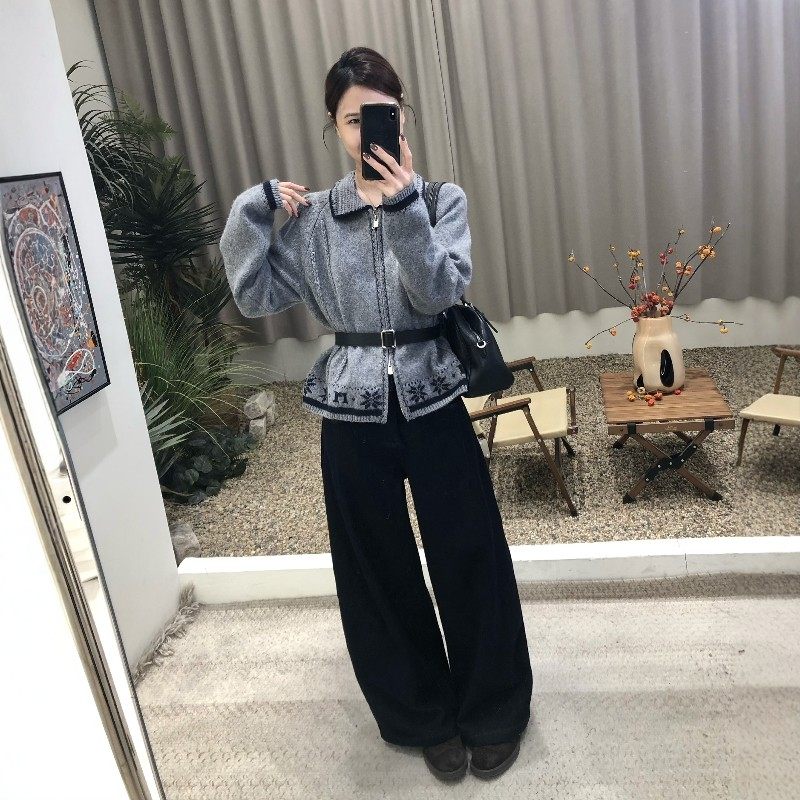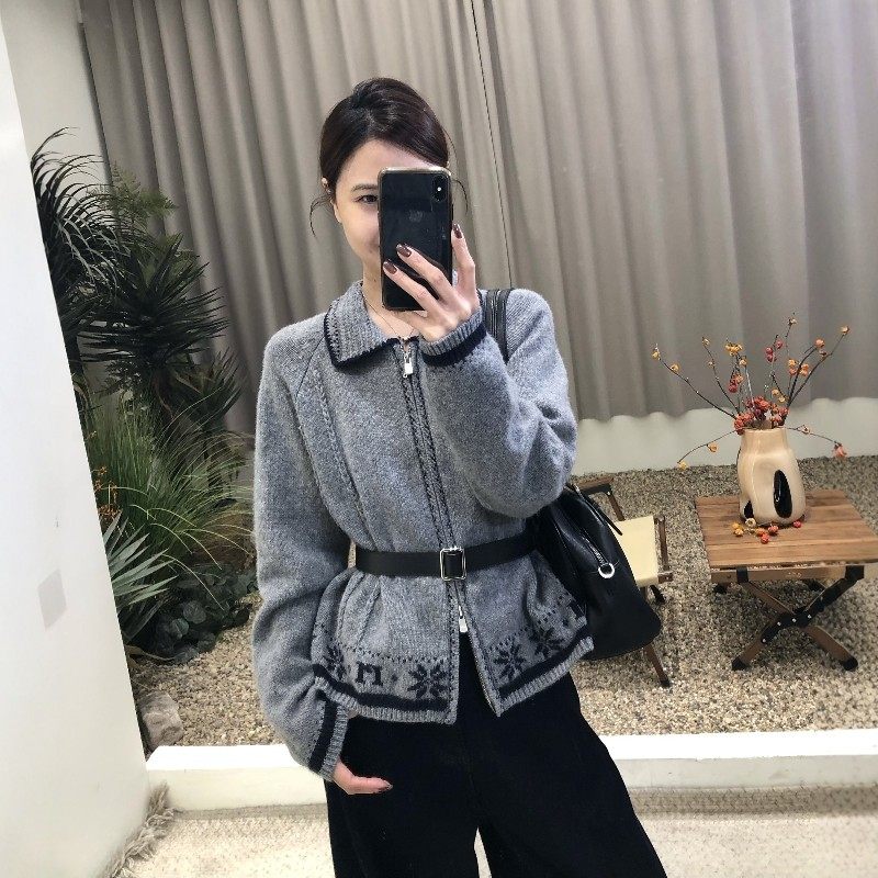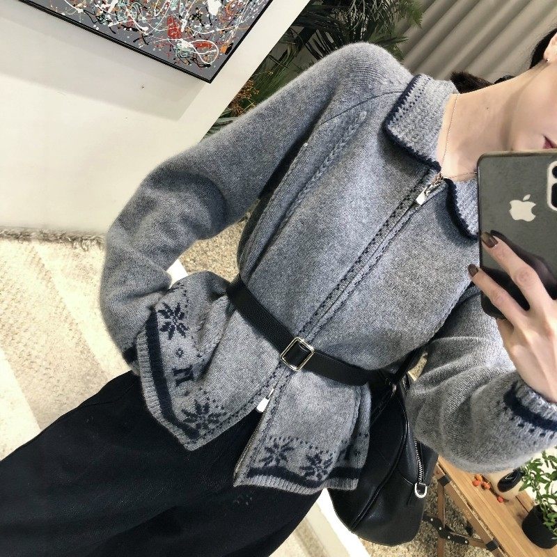 2025年秋冬韩系穿搭双拉链高领灰色毛衣外套女设计感针织开衫上衣