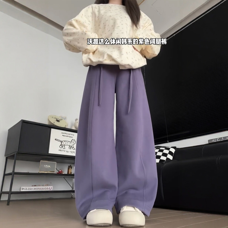 紫色抽绳阔腿弯刀裤子女胖mm大码显瘦秋冬季慵懒风休闲运动镰刀裤