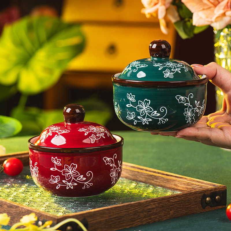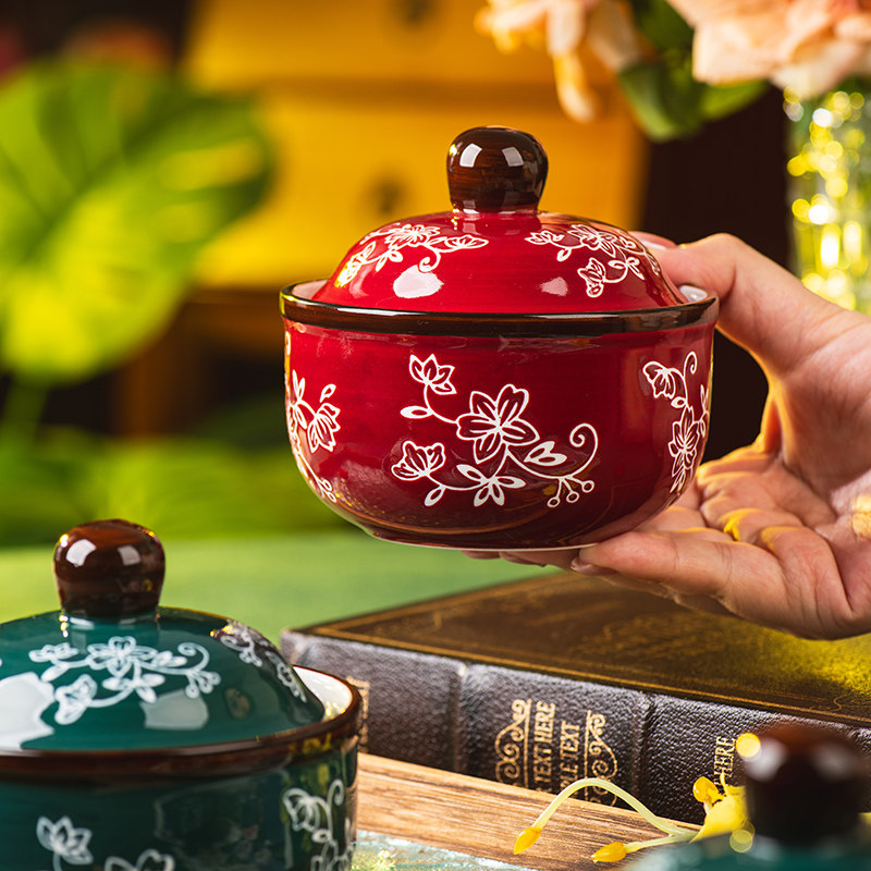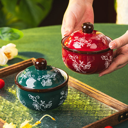 藤花炖盅陶瓷瓦罐汤炖盅家用高颜值蒸盅隔水炖带盖一人份汤盅炖罐