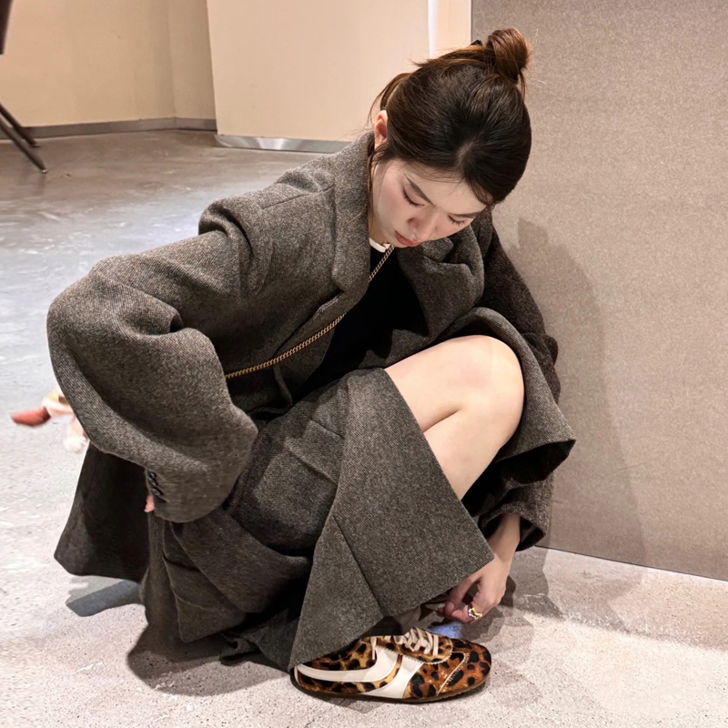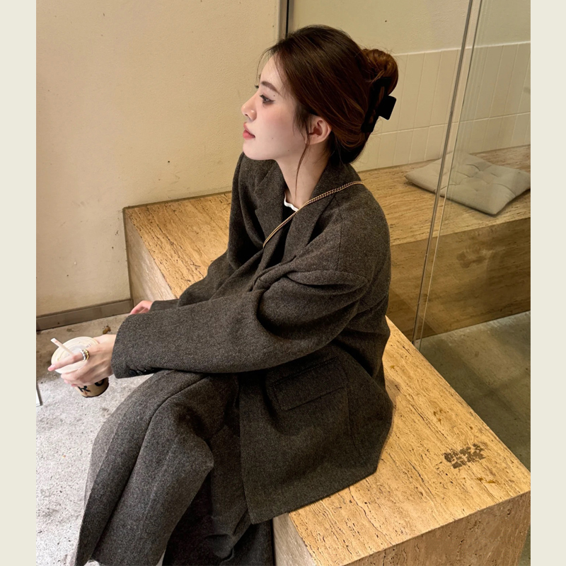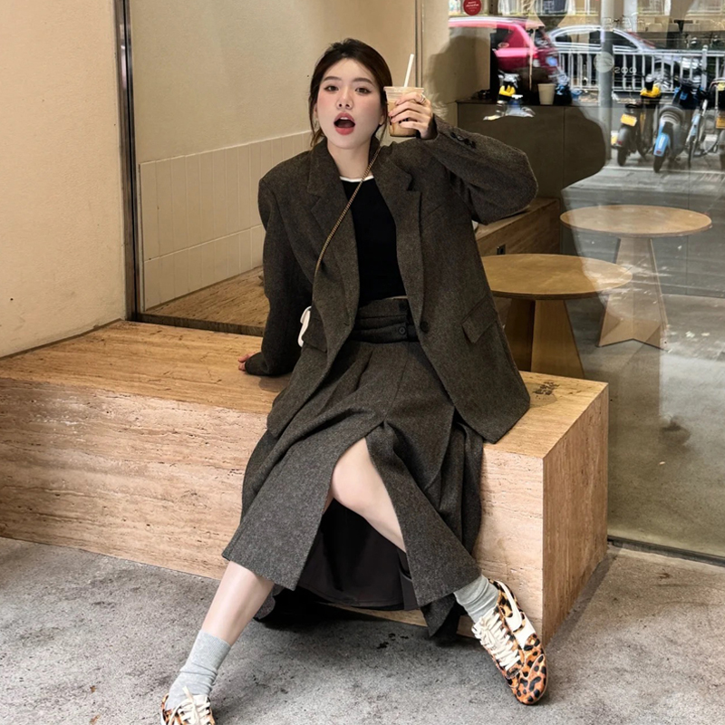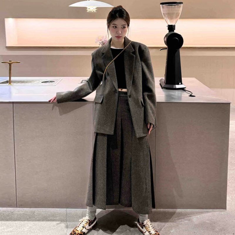 复古格雷系毛呢套装秋冬高级感通勤设计感西装外套开叉半裙两件套