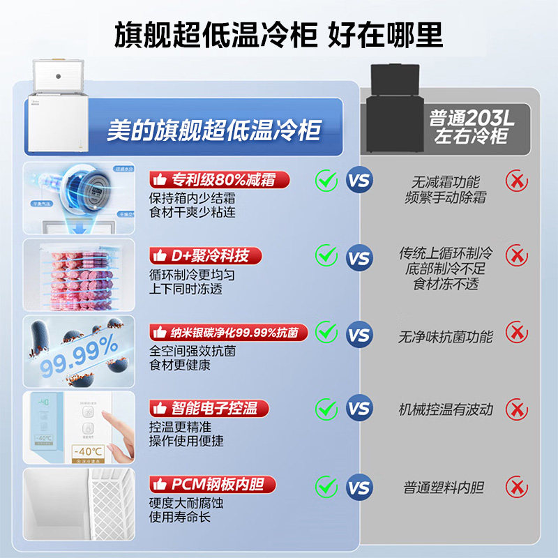 【-40℃旗舰超低温】美的冰柜200升+冷冻冷藏家用小型冷柜大容量