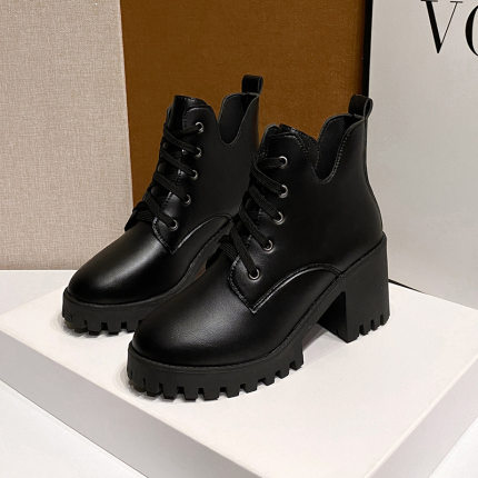 小个子通勤风中高跟鞋女粗跟高级感小短靴女真皮舒适防水台马丁