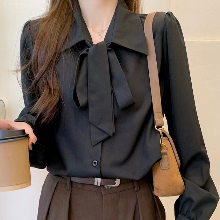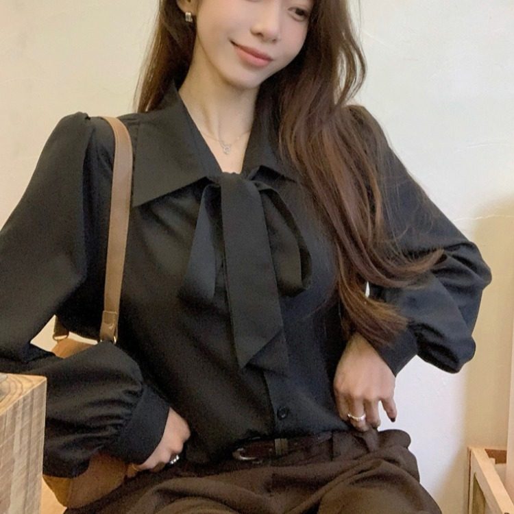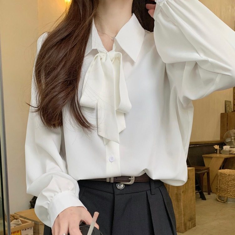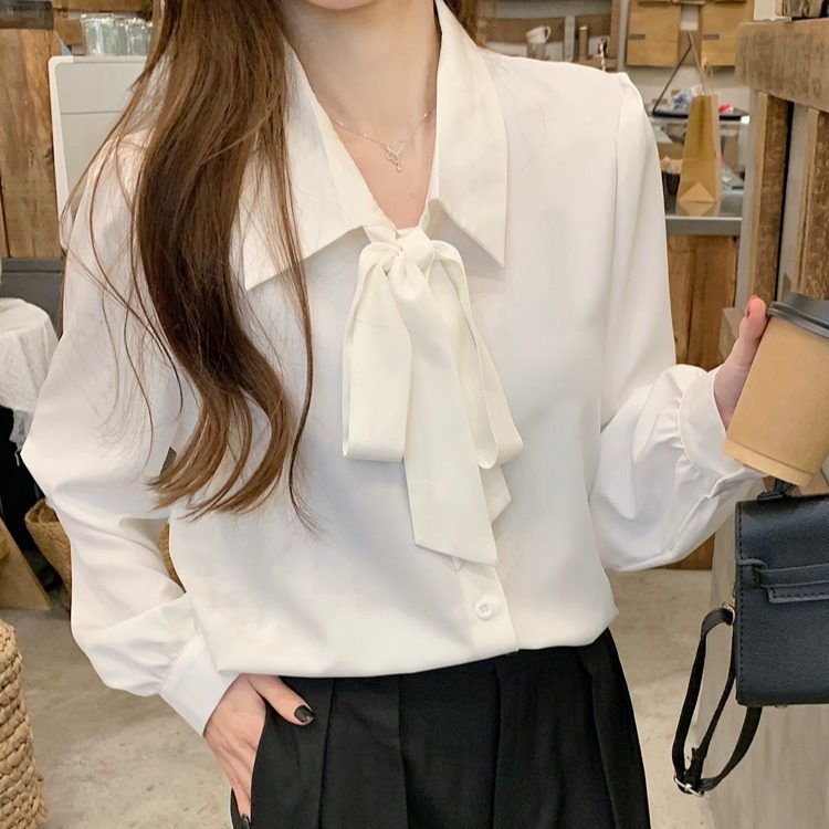 白色雪纺衬衫女灯笼袖韩系大码胖mm正装设计感小众蝴蝶结上衣
