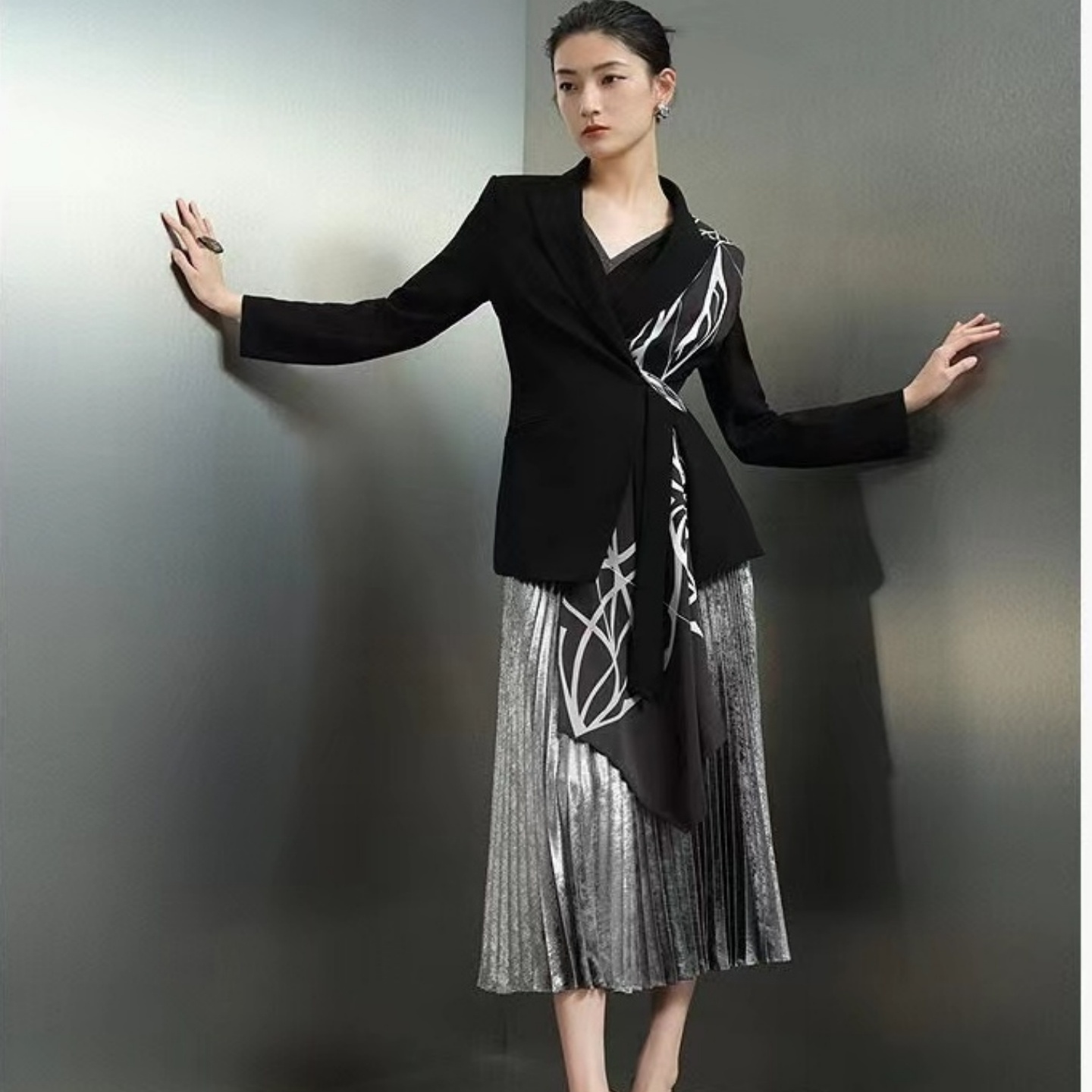 商场同款2025秋季新款艺术家联名印花丝巾中长款西装女XA02365W0