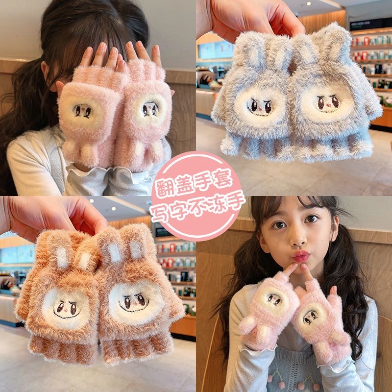 拉布布儿童手套冬季保暖半指女童加厚可爱宝宝翻盖写字五指手套