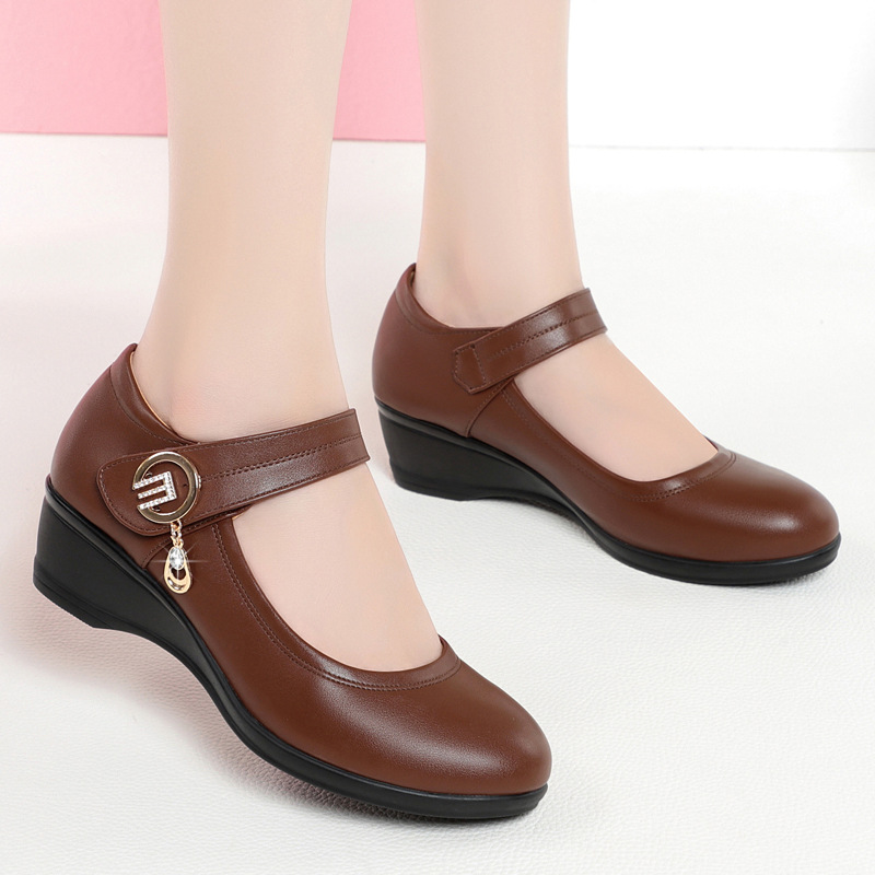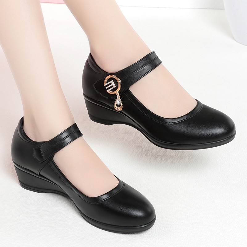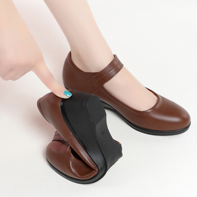 真皮软底一字扣带中老年妈妈单鞋跳舞女鞋大码圆头工作鞋女士皮鞋