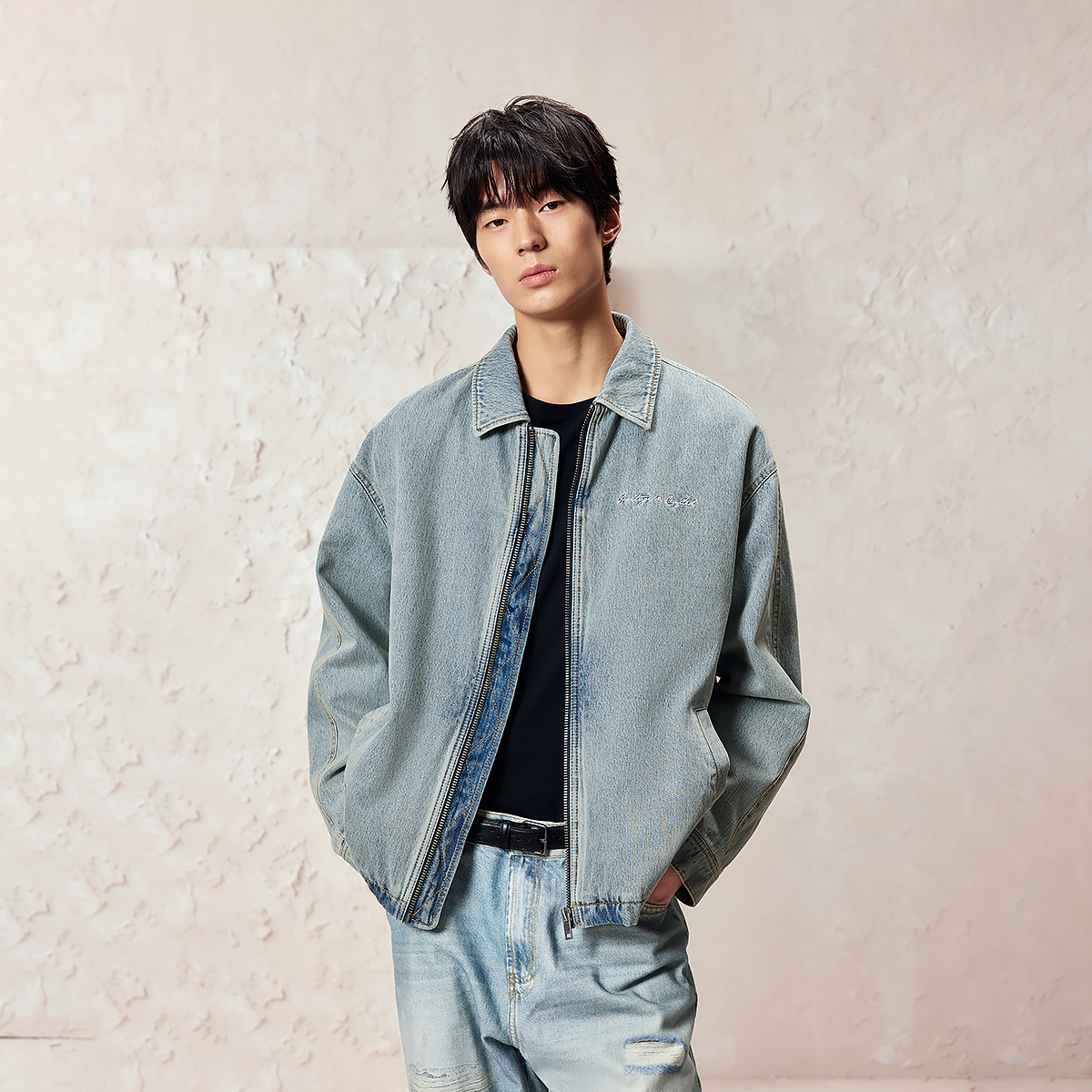 杰克琼斯男装冬夹克牛仔宽松字母刺绣拉链翻领插袋纯色日常外套