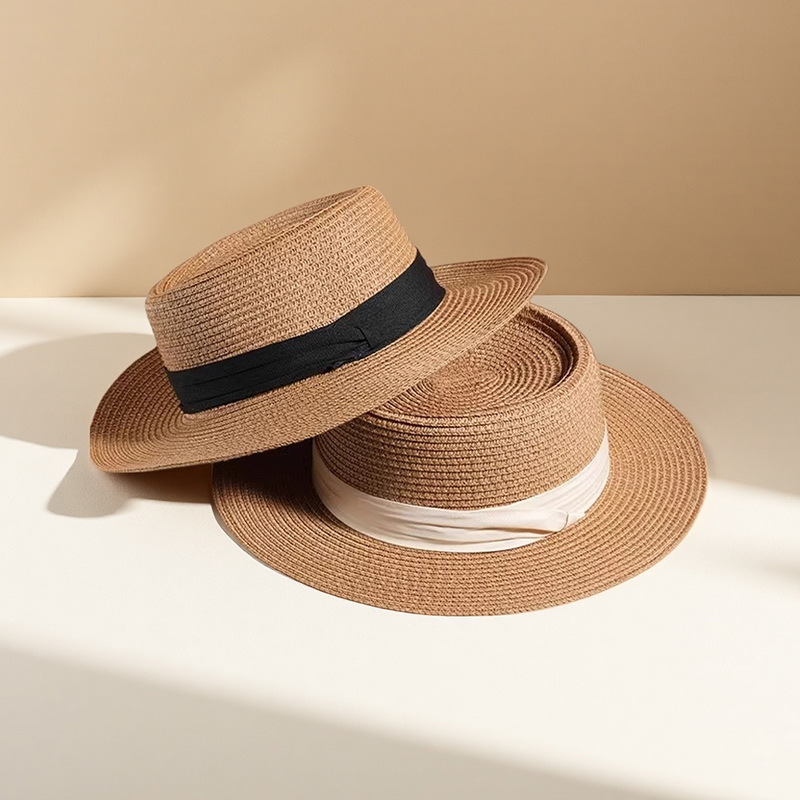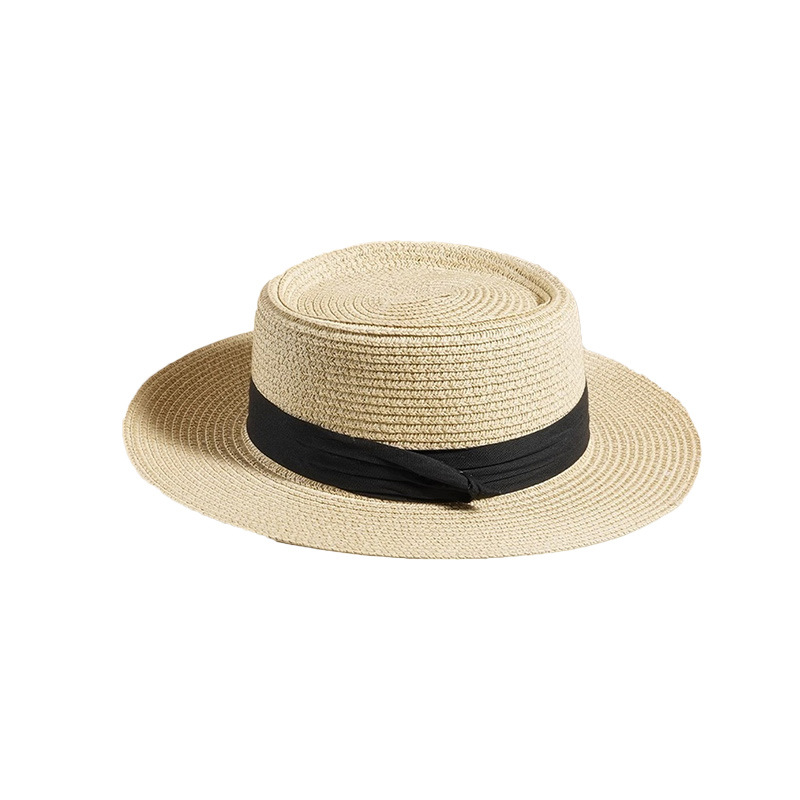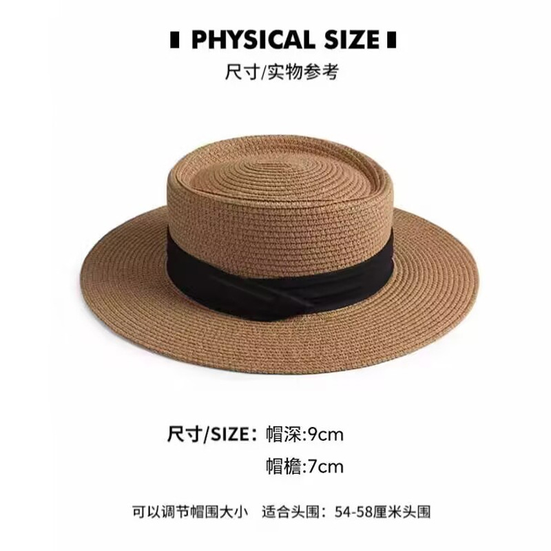 法式平顶草帽女夏季平檐海边沙滩度假礼帽大头围草编防晒太阳帽子