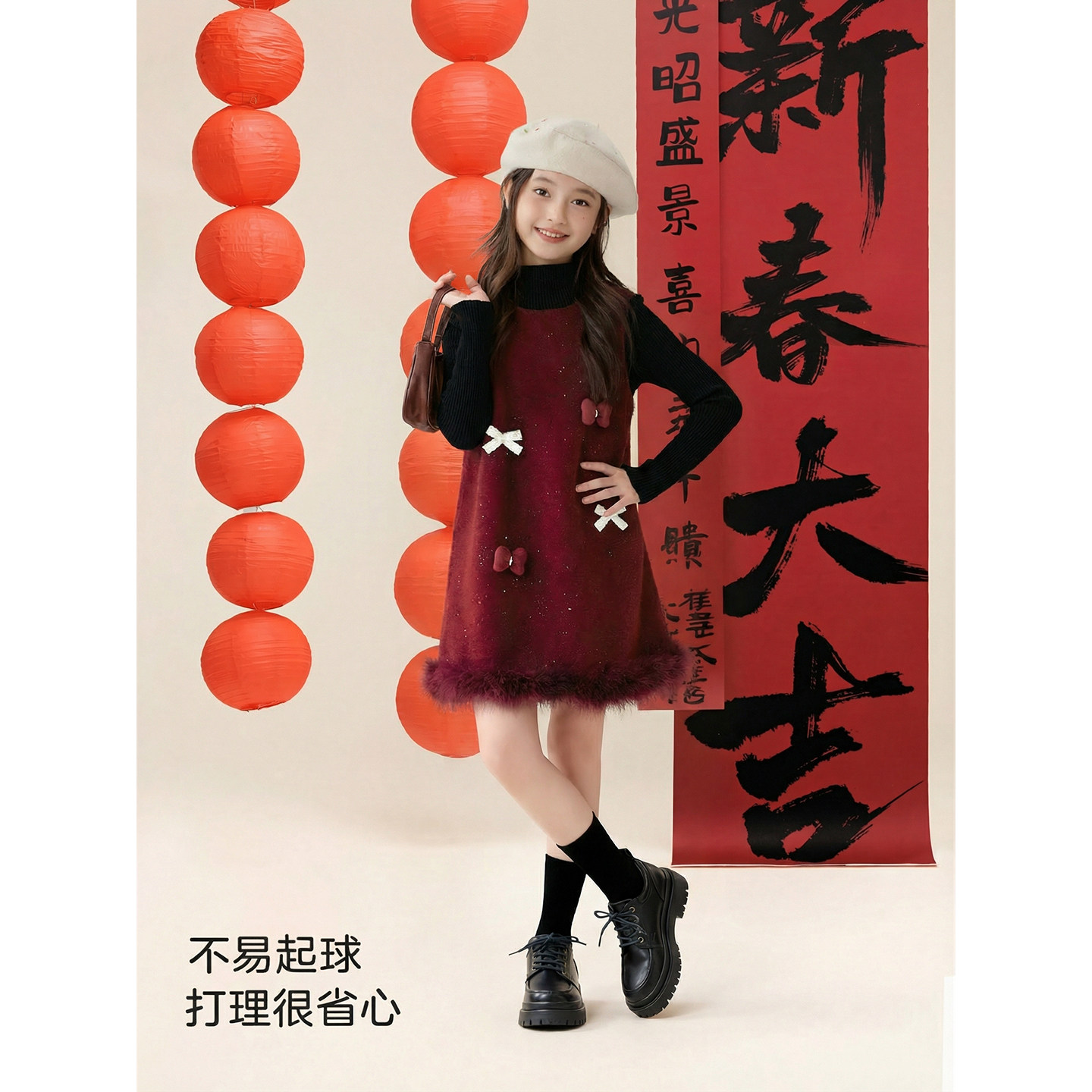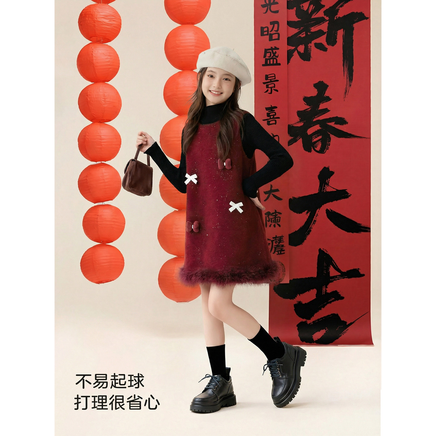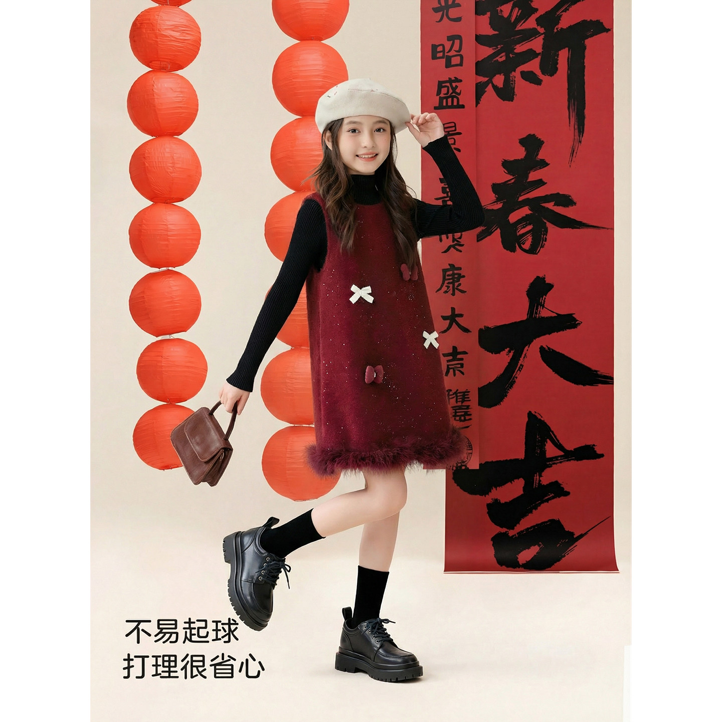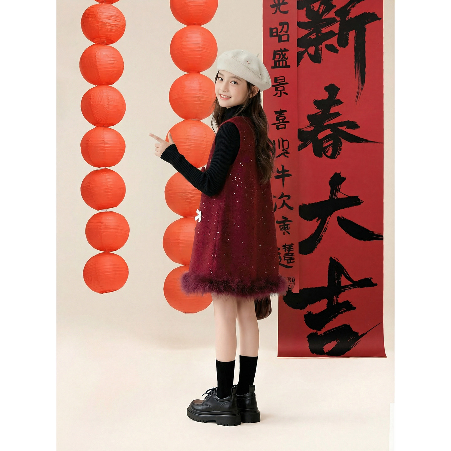 女童裙子秋冬新款2026儿童加绒毛呢裙套装女孩新年衣服公主连衣裙