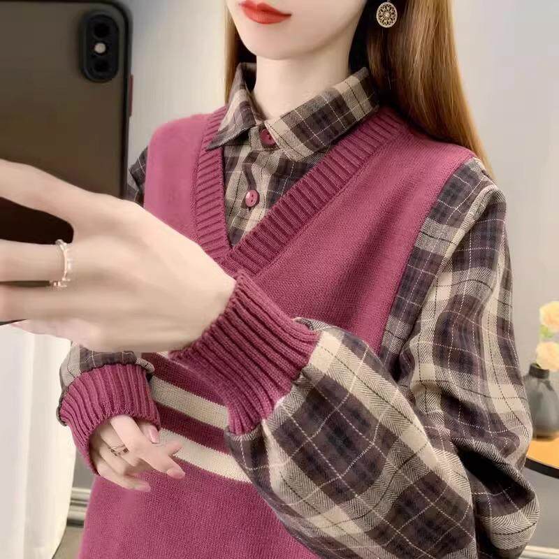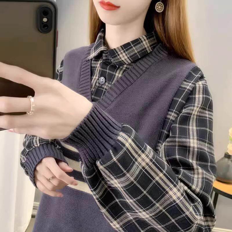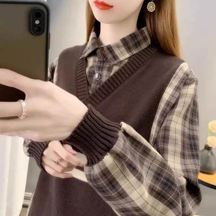欧洲站拼接假两件格子衬衫长袖上衣女春秋冬季套头马甲毛衣打底衫