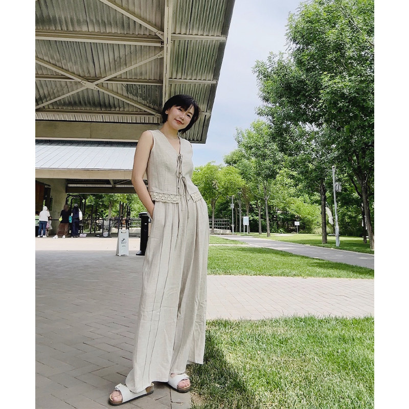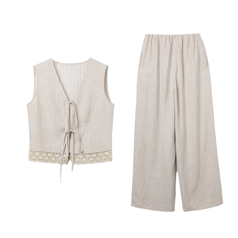糖皮出品 夏日颂 镂空花边底摆 原胚色亚麻肌理 阔腿裤套装