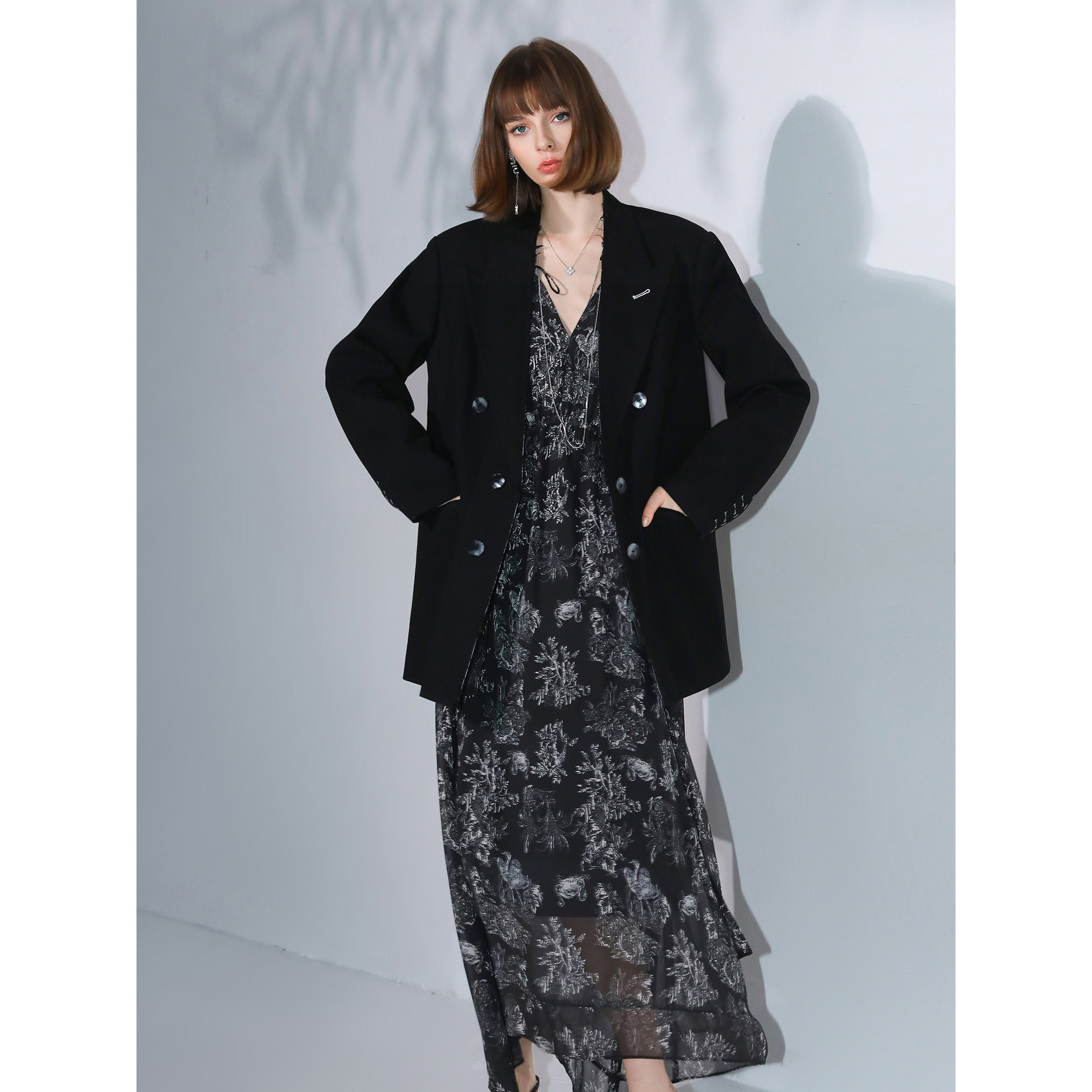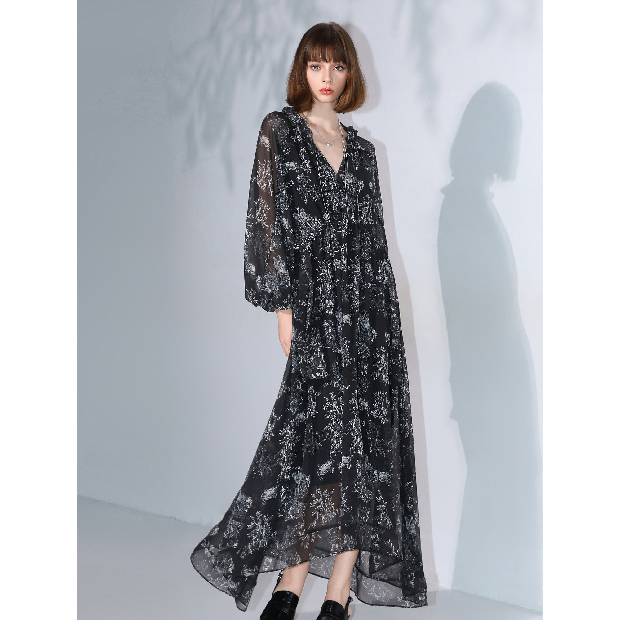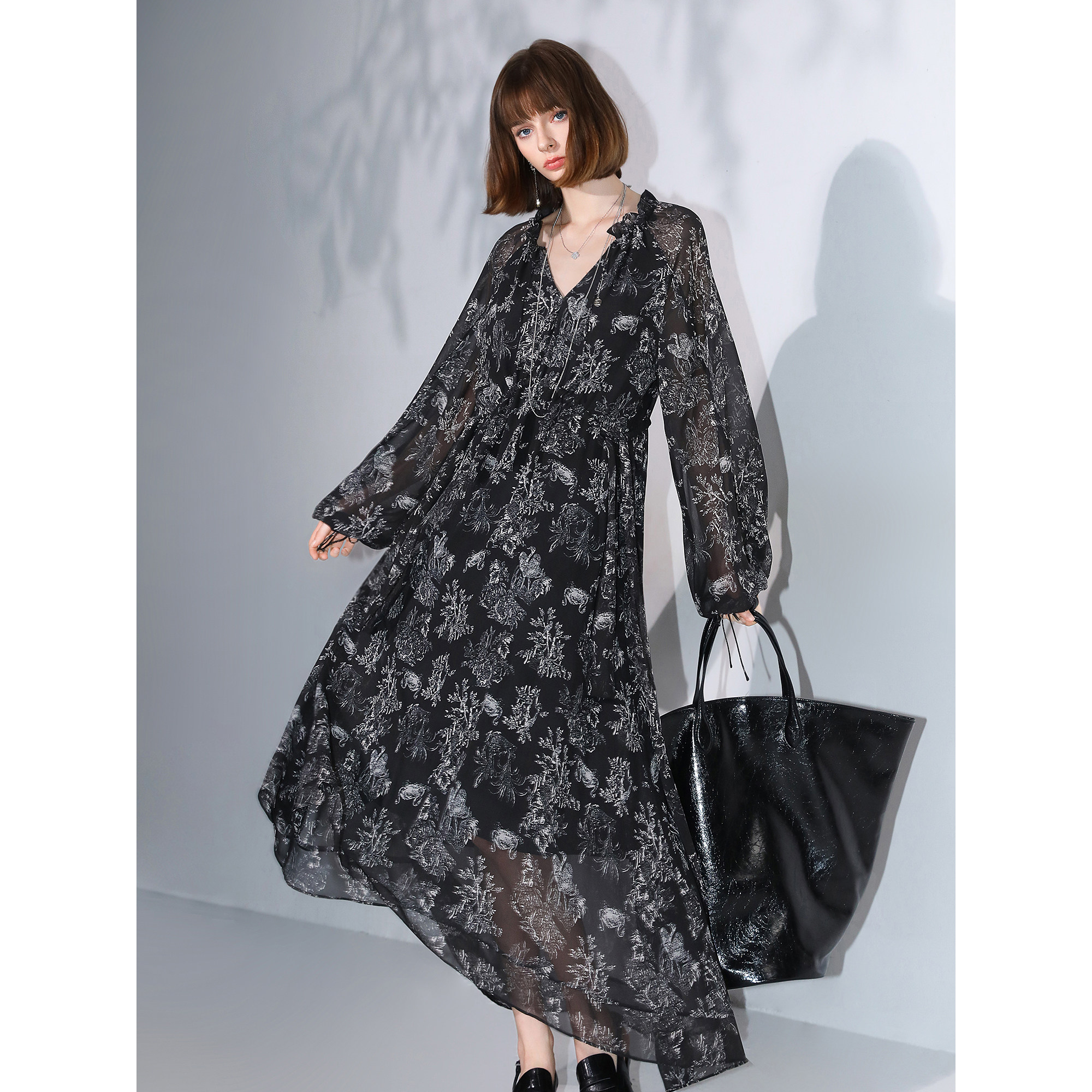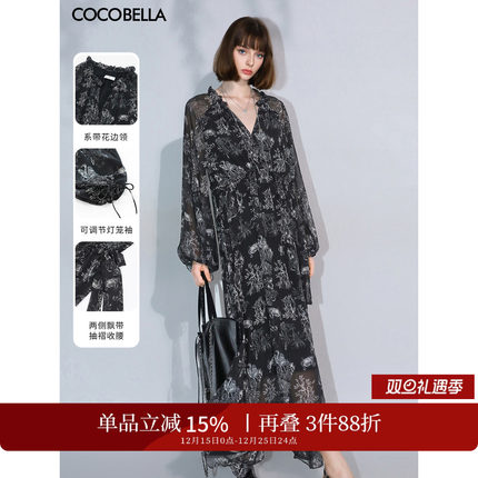 COCOBELLA气质植物印花飘逸大摆连衣裙V领雅致女人味长裙FR3060