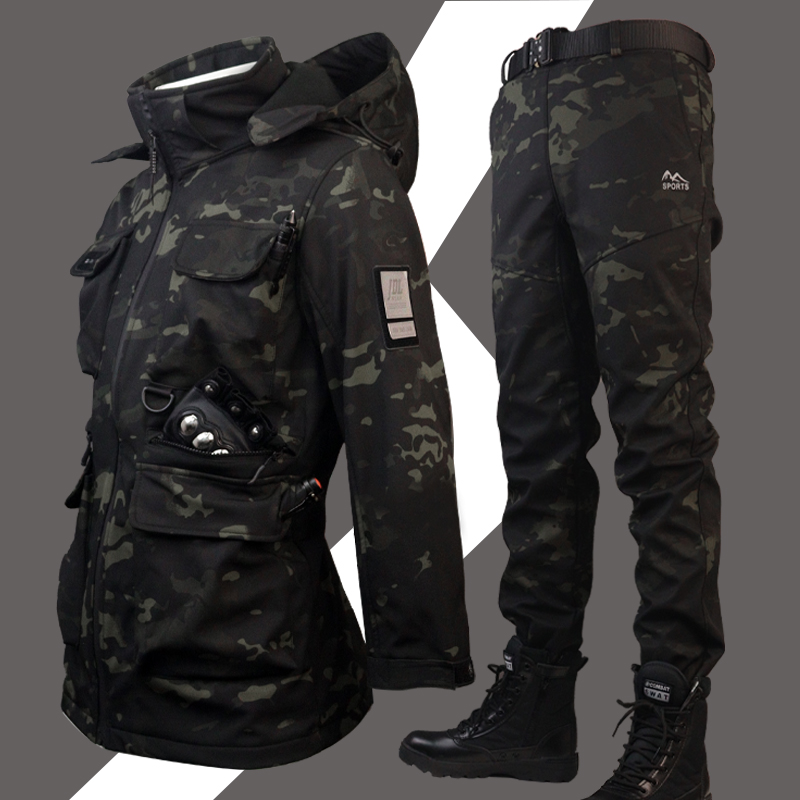 户外秋冬季迷彩冲锋衣套装加绒保暖黑色防水战术棉服野营登山服装
